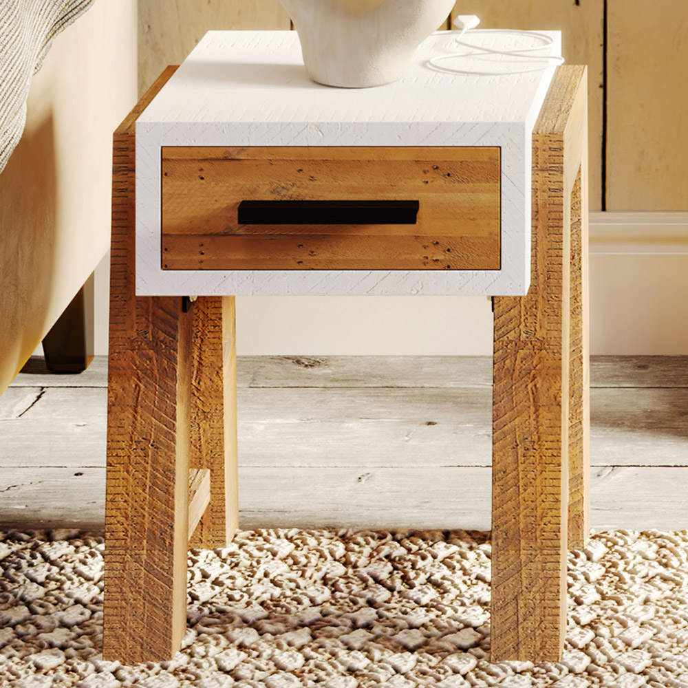 Add a touch of rustic charm to your space with this Baumhaus Trinity Single Drawer White and Brown Open Side Table. Stylish and sustainable, it's crafted from 100% reclaimed external timbers and displays intentionally preserved nail holes and scars for weathered wood appearance. It's painted white and also sports natural areas that are treated with a clear protective lacquer. This table features one drawer that offers convenient storage space for small items. Plus, it comes with a five-year warranty against manufacturing defects to allow you to enjoy a charming and long-lasting piece. Size: H45 x W37 x D30cm. Drawer size: H8 x W35 x D25cm.