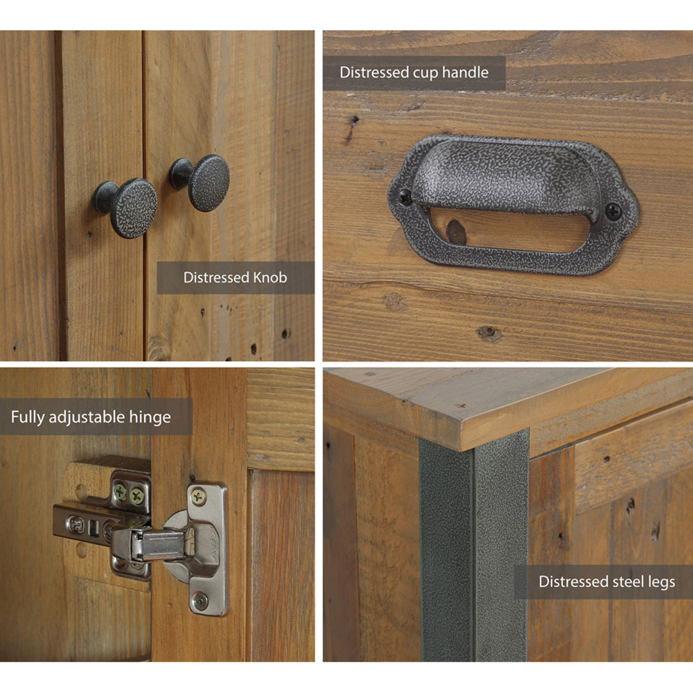 Add comfort and functionality to your home office space with the Baumhaus Urban Elegance Single Door 4 Drawer Wooden Twin Pedestal Home Office Desk. The left-hand pedestal has a large suspension filing drawer (for foolscap files) and two drawers. The right-hand pedestal has a cupboard with a removable shelf ideal for a computer tower or printer, and a drawer. The hinged pull-out keyboard drawer with steel runners has plenty of space for a keyboard and mouse. This truly unique piece is crafted from solid reclaimed rough-sawn wood which combines perfectly with the steel legs for a contemporary, rustic twist on industrial design. Finished in a resilient satin lacquer for durability and to enhance the unique tone and natural imperfections of the wood.