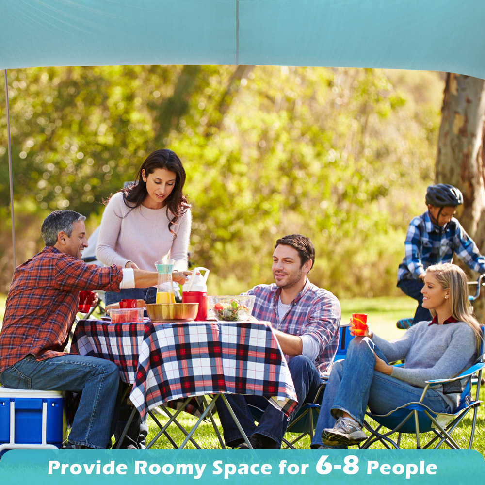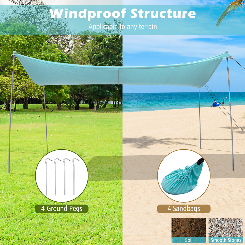 This sun-proof canopy is crafted from high-tensile polyester-Lycra, offering excellent protection from harsh sunlight while keeping you comfortable with natural light. Besides, enhanced with extra wind ropes, 4 ground pegs, and sandbags for stability, it is perfect for any outdoor environment. Portable and easy to set up, the foldable support poles and removable canopy can be effortlessly packed in a lightweight carrying bag for on-the-go convenience. Measuring a generous 300 cm x 300 cm, the spacious shelter comfortably accommodates 6-8 people, making it an ideal choice for group gatherings, small parties, or family camping trips. Experience immediate utility and convenience with our Easy to Setup beach tent, allowing you to enjoy your outdoor activities without worries. If you are looking for such a product, do not hesitate to buy it! Sun-proof Canopy: Crafted from high-tensile polyester-Lycra, this beach canopy shields you from harsh sunlight while allowing you to enjoy natural light. Besides, the durable fabric is anti-wear, quick-drying, and washable for long-lasting protection. Wind-proof Design: Enhanced with extra wind ropes, 4 ground pegs, and sandbags for stability, this portable beach shade withstands strong winds. Its sharp-ended pegs ensure easy insertion on any terrain, making it ideal for outdoor environments. Portable and Wide Application: The foldable support poles and a removable canopy are packed in a lightweight carrying bag for your convenience. It offers great protection in various scenarios, such as beach, backyard, or lake. 8 People Large Shelter: Measuring a generous 300 cm x 300 cm, this spacious beach shade comfortably accommodates 6-8 people, making it ideal for group gatherings, small parties, or family camping trips. Easy to Setup: Setting up this portable beach tent is a breeze. Simply lay out the canopy, fill the sandbags for stability, and support the shelter with poles. Adjust the number of poles to create the ideal configuration for your needs, offering immediate utility and convenience.