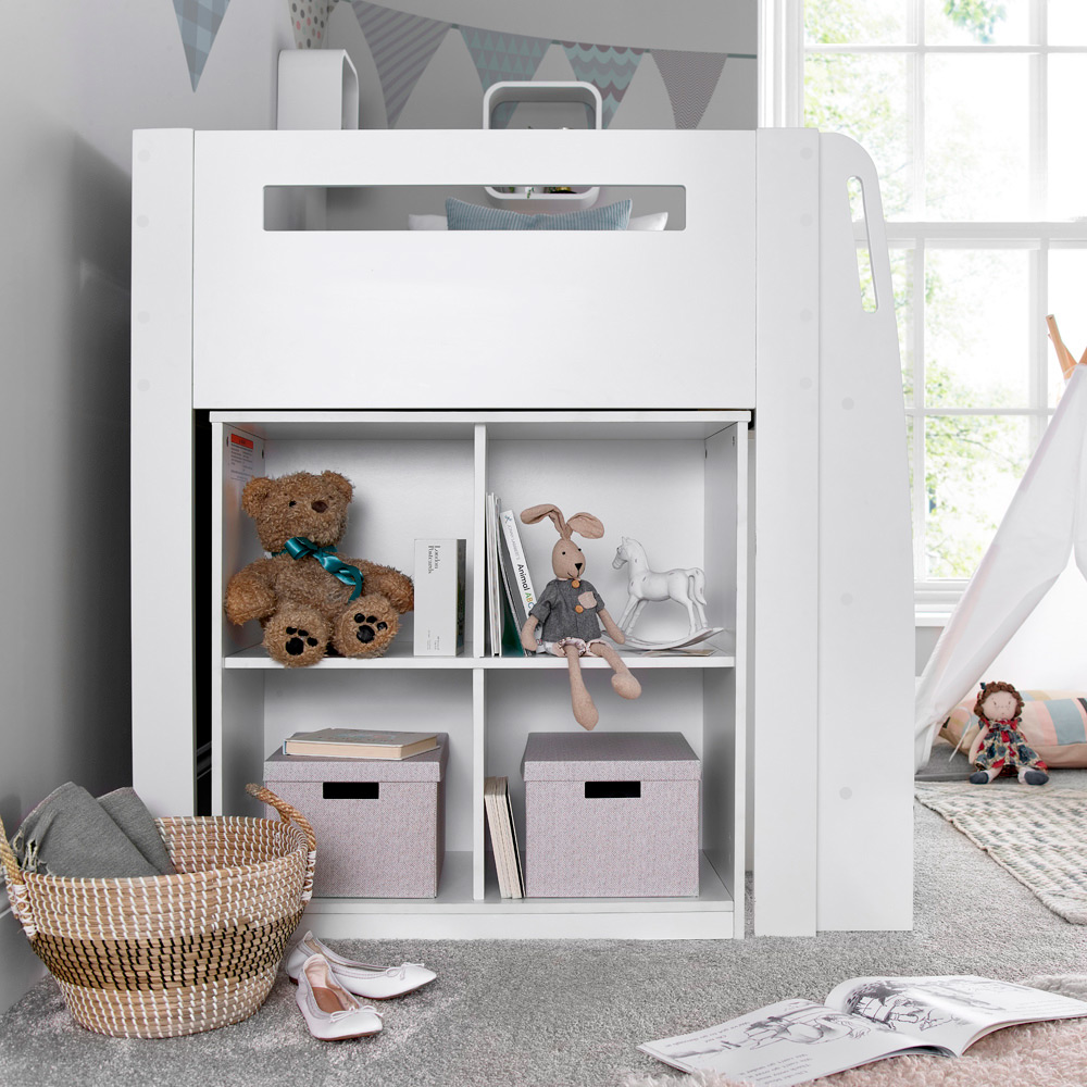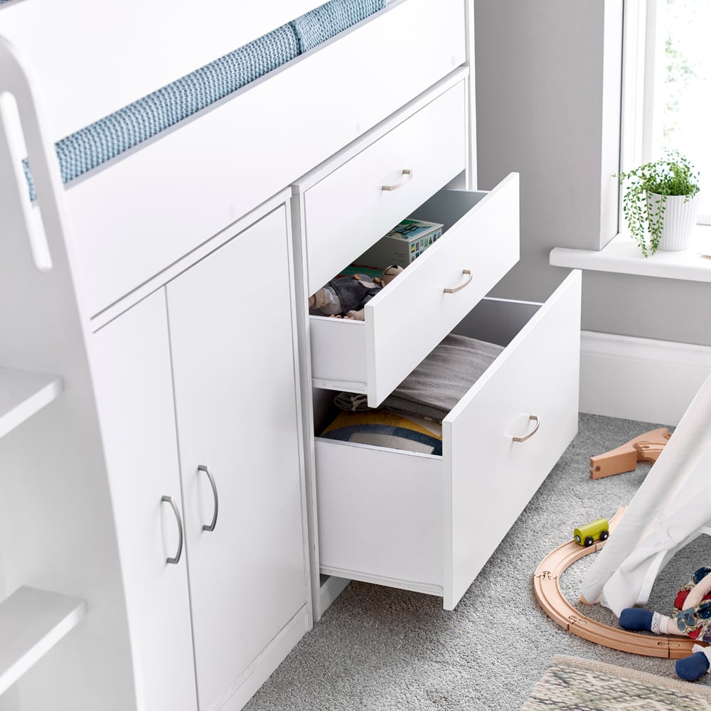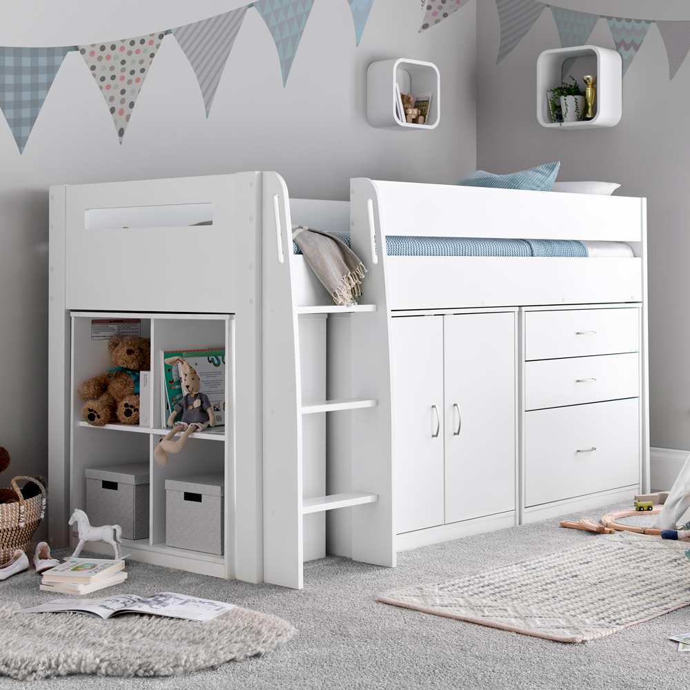 Get the complete comfort package with the Bedmaster Lacy White Storage Mid Sleeper with Pocket Sprung Mattress. With its contemporary design and versatile finish, this bed is a fantastic addition to any bedroom, whether it's a vibrant kid's room or a more mature teenager's haven. Combining modern aesthetics with timeless appeal, it's ideal for those looking to update and elevate their bedroom decor. The bed offers an abundance of functional storage options with three spacious drawers for storing bedding or smaller clothing items neatly out of sight, and a two-door cupboard with two shelves provides even more storage space. The practical cube shelving unit at the end of the bed is ideal for displaying favourite toys and decorative items or organizing a collection of books. Understanding the importance of your child's safety, the bed is built to the highest safety standards. Safety railings on the bed reduce the risk of nighttime tumbles, providing peace of mind for both parents and children. The sturdy ladder features cut-out handles for easy access and can be assembled on either the left or right side. Delivered flat-packed for your convenience. This also comes with one Bedmaster Theo Single Pocket Sprung Mattress. The micro-quilted turn-and-rotate pocket sprung mattress is tested to BS7177. Mattress depth: 15.5cm.