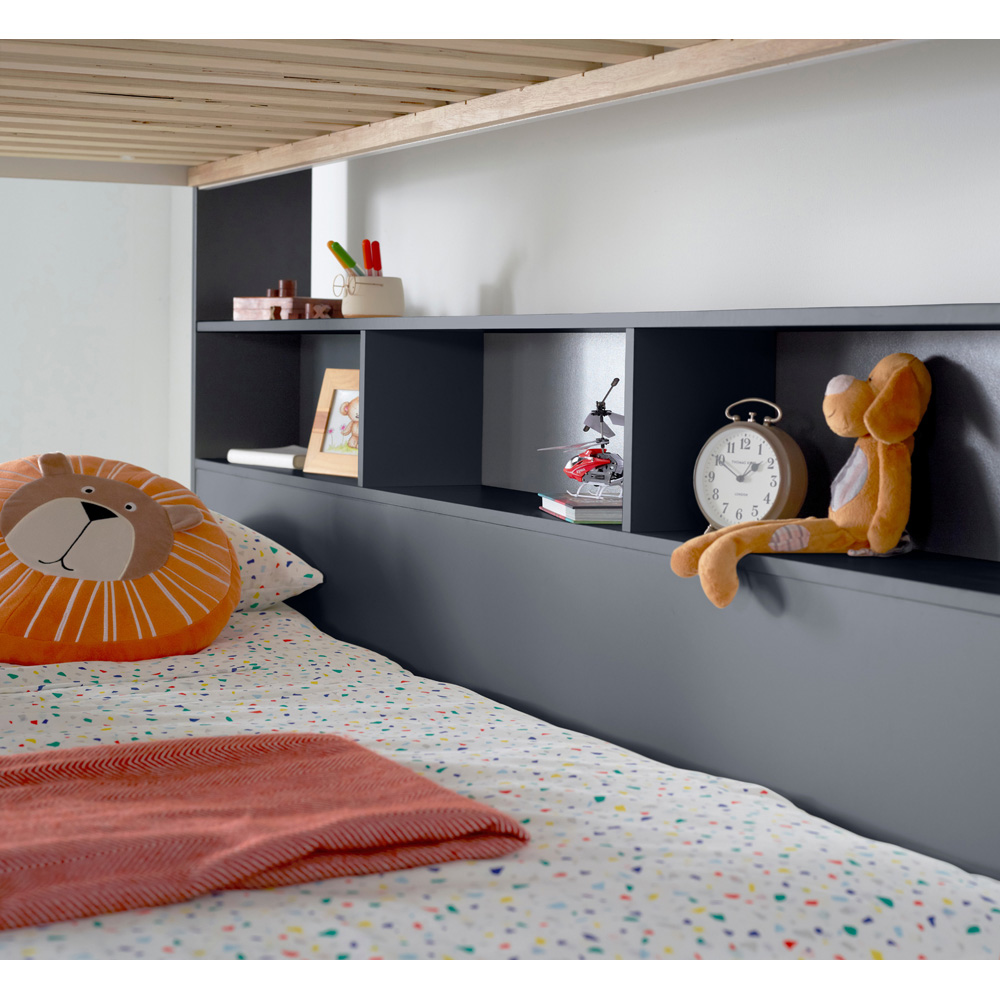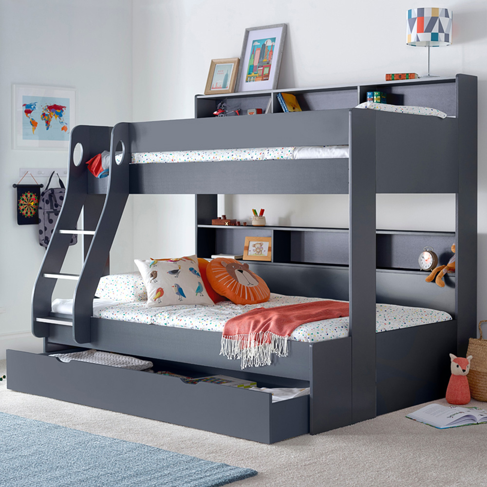 Discover the ultimate in functionality and style with the Oliver Onyx Grey Triple Sleeper Bunk Bed, designed to make the most of your space while providing a sleek, modern look. This versatile bunk bed features a single top bunk and a small double bottom bunk, each equipped with handy shelves and dividers for storing books, toys, and other essentials. The sturdy ladder has cut-out handles for safety and can be configured to fit either the left or right side, ensuring flexibility in any room layout. The lower bunk's close-to-the-ground design enhances safety and contributes to a spacious room feel. Additionally, the optional pull-out storage drawer offers extra space to keep your surroundings tidy. Crafted from solid Rubberwood and finished in an elegant Onyx Grey, this bunk bed comes complete with two Bedmaster Theo Pocket Sprung mattresses, making it a stylish and practical choice for any home.