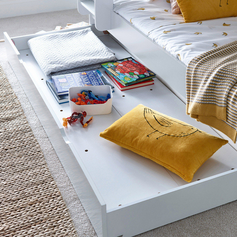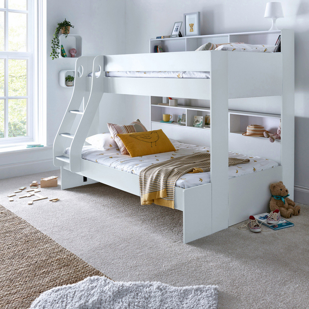 Elevate your children's room with the Oliver White Triple Sleeper Bunk Bed with Drawer, a sleek and modern solution for sleep and storage. This triple sleeper combines functionality with style, featuring a single-size top tier and a small double bottom tier, each with built-in shelves and dividers for easy organisation of books, toys, and other essentials. The sturdy ladder has cut-out handles for safety and can be fitted on either side, accommodating any room layout. The lower bunk's close-to-ground design enhances safety and contributes to a spacious room feel. Crafted from solid Rubberwood, this bunk bed is not only stylish but also robust, making it a perfect fit for any home décor.