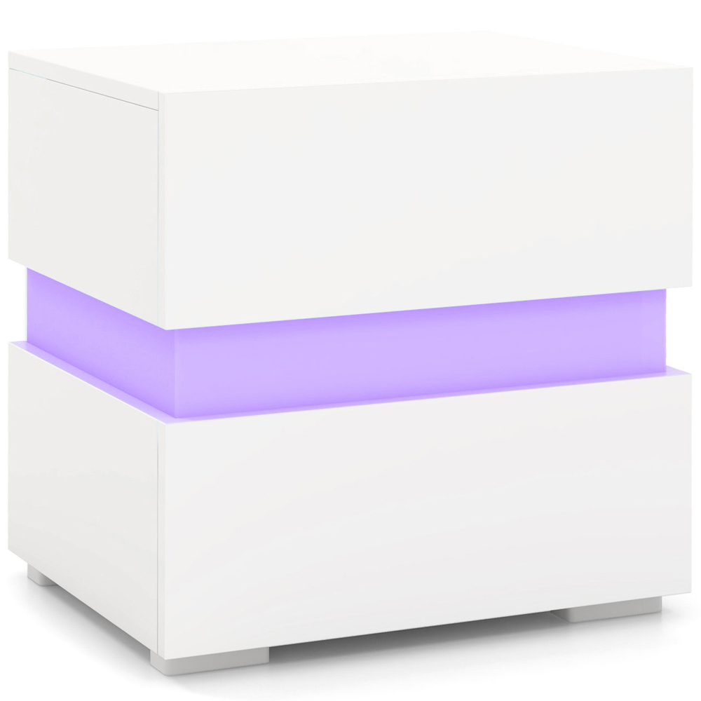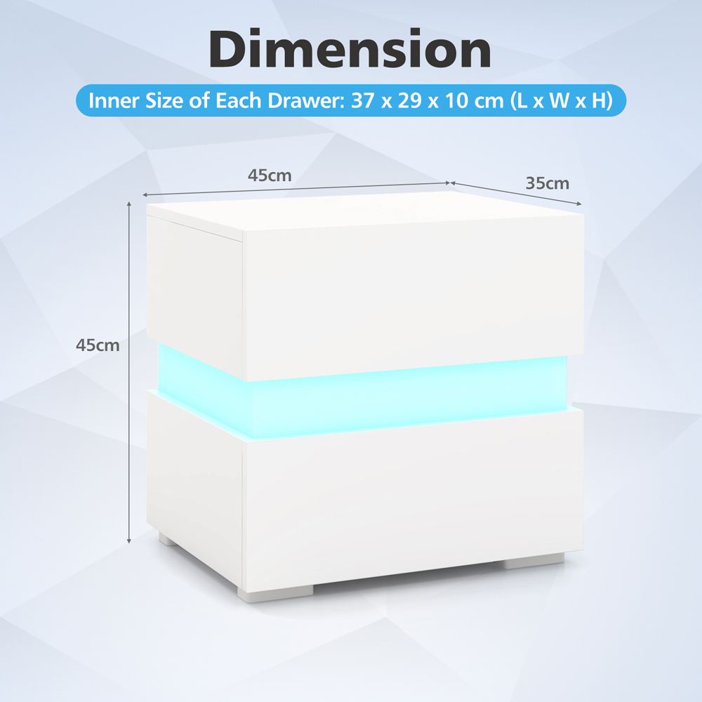 Illuminate your space with the stylish Costway 2 Drawer White LED Bedside Table, featuring a modern finish and vibrant LED lighting. This nightstand offers a place to rest your book or phone and transforms into a dynamic light show with 22 dynamic modes, 20 static colours, and seven direct colours, all adjustable via a convenient RF wireless remote. The wide tabletop and two smoothly sliding drawers provide ample storage, while the integrated cable management ensures a tidy setup. Whether placed in the living room, bedroom, or study, this LED nightstand adds a touch of modernity and practicality to any room.