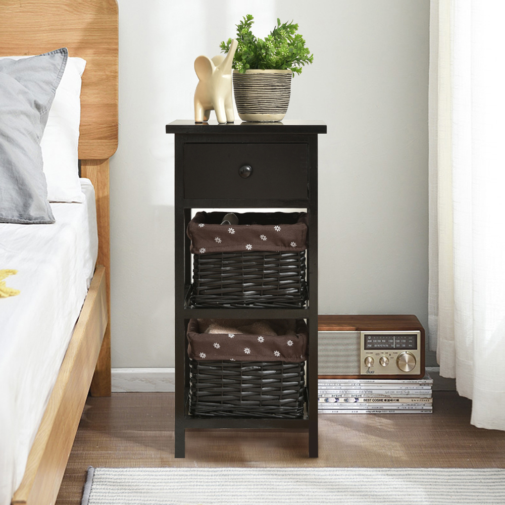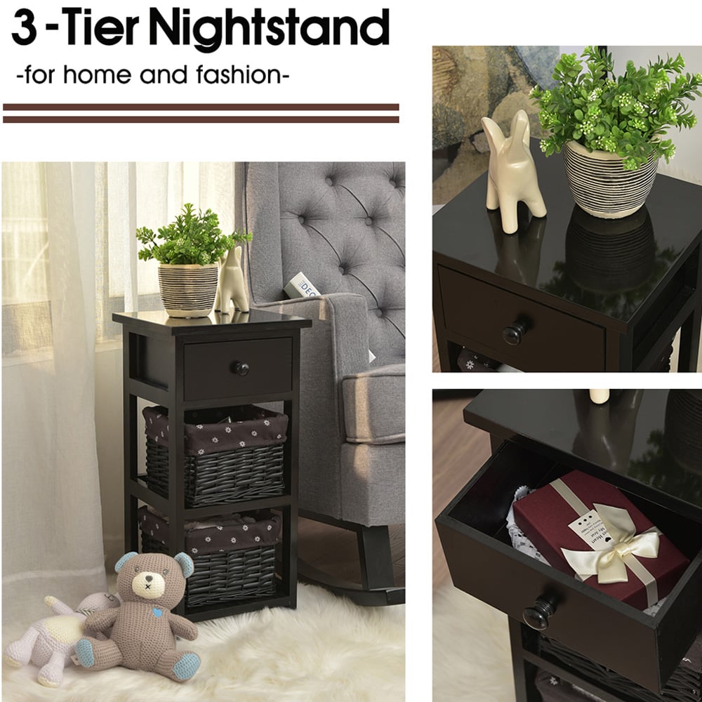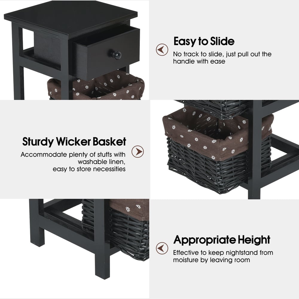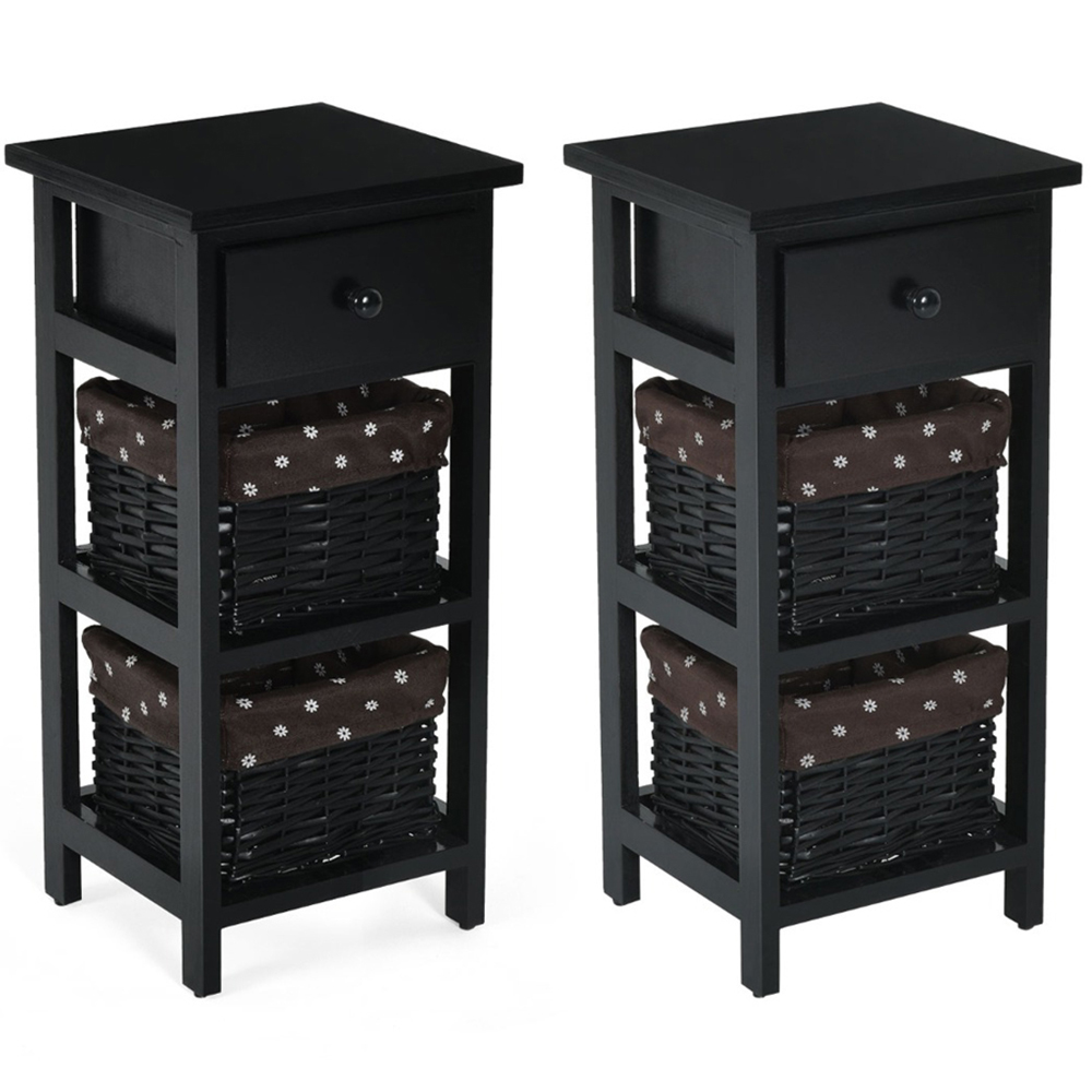 Costway Single Drawer 2 Shelf with Woven Basket Black Bedside Table Set of 2