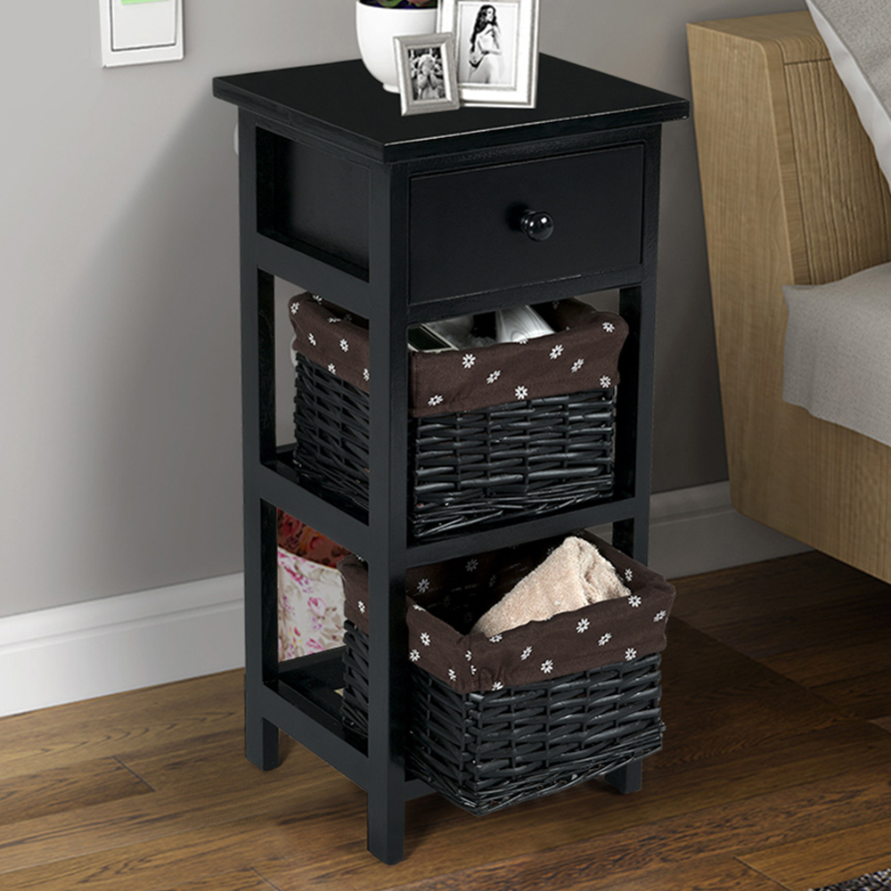 Enrich the beauty of your bedroom decor with the Costway Single Drawer 2 Shelf with Woven Basket Black Bedside Table Set of 2. This set has a smooth top design for keeping your alarm clock or display items. It features a single drawer with a sleek knob and two woven baskets with removable fabric covers and decent storage space. These units are crafted using sturdy and corrosion-resistant paulownia wood for durability and longevity. They also feature sturdy and elevated feet with anti-slip foot pads for stability and support. This multipurpose bedside table set can be kept in the bedroom, living room, hallway or bathroom. The smooth and easy-to-clean surface allows for hassle-free maintenance. This elegant set is ideal for all types of modern and traditional interior spaces.