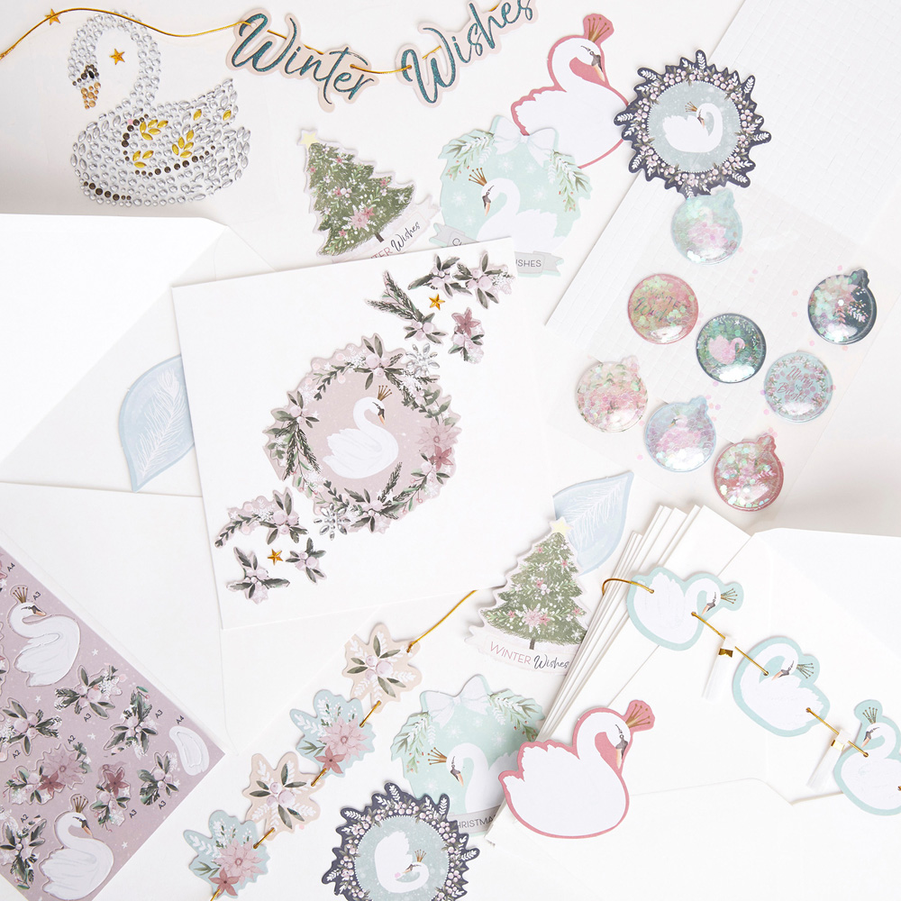 Embellish with Enchanted Swan. Add a touch of magic to your papercrafts with this gorgeous Enchanted Swan selection. Evoking the fairy-tale wonder of The Swan Princess, this magical collection sparkles with white iridescent glitter. Feathers, florals and snowflakes are rendered with a muted palette of pastel shades and patterns. Perfect for autumn and winter projects, or for sending loved ones magical Christmas sentiments. Contents include: Mini Garlands , Die-cut Toppers, Mini 3D Decoupage, 3D Foam Squares, Dome Stickers, Large Gem Sticker, 10 Cards & Envelopes.