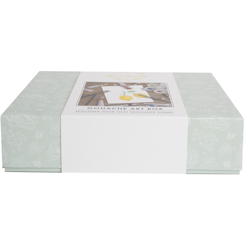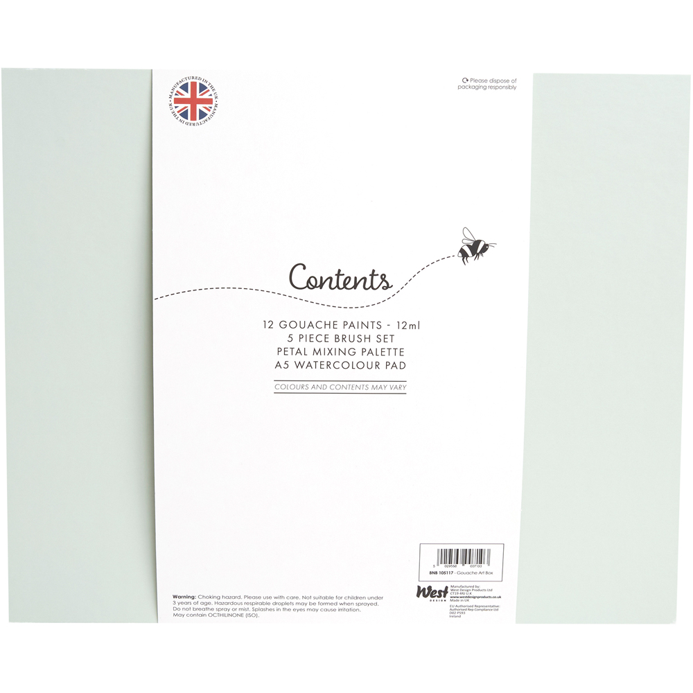 Discover your next favourite hobby. Gouache paints are like a more opaque watercolour, with a heavier texture, making them a great way to explore a variety of techniques and discover your own style. This set comes with the perfect selection of colours to get you started. You also get a variety of brush types that will give you the freedom to produce all types of work, a handy petal palette for mixing your colours and a high-quality pad, with thick watercolour paper sheets. Contents includes, 12 Gouache Paints - 12ml. 5 Piece Brush Set. Petal Mixing Palette. A5 Watercolour Pad.