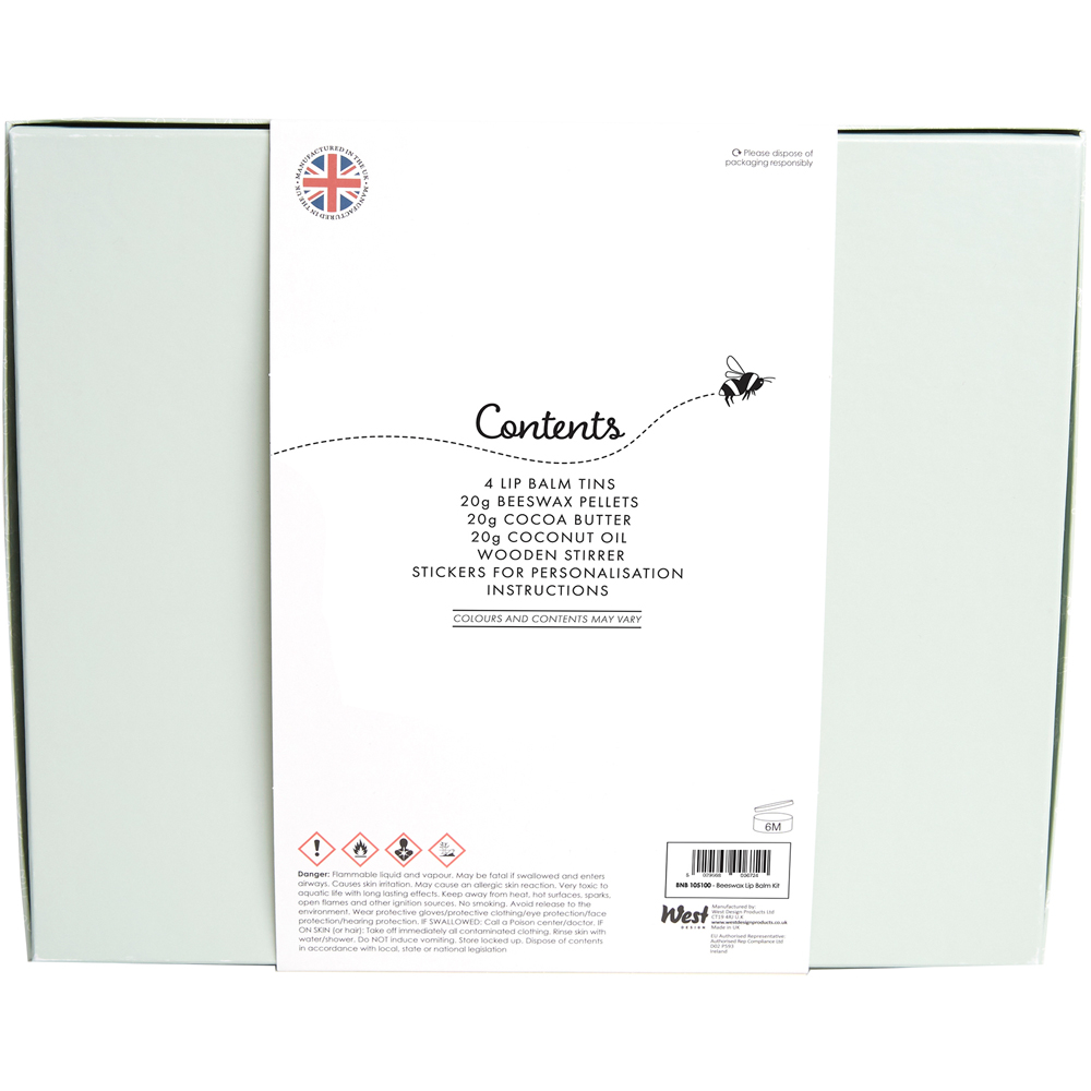 The conditioning beeswax and nourishing coconut oil keep your lips hydrated and full for longer. With a smooth and creamy texture, it's perfect for avoiding dry chapped lips. You get enough ingredients to make 4 tins, that you can personalise with the sticky labels. Keep them all to yourself, or maybe gift one to your closest friend. Contents include 4 Lip Balm Tins and 20g Beeswax Pellets. 20g Cocoa Butter. 20g Coconut Oil. Wooden Stirrer. Stickers for personalisation and Instructions.