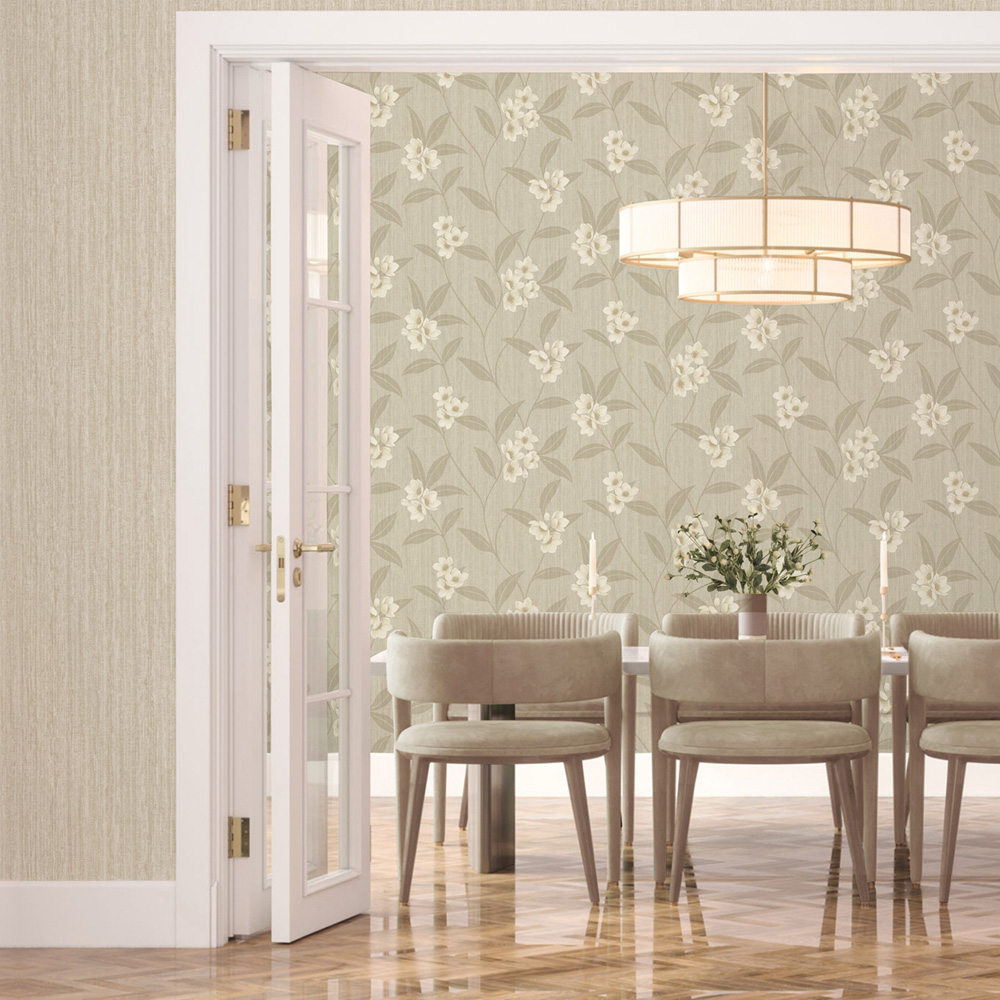 Giovanna Floral -new to the luxury Italian Giovanna wallcovering collection. Giovanna Floral is a timeless floral trail with exquisite embossed detail. The intricate detail captures the light in many different directions, creating a sense of movement and elegance. The trail sits on the very popular distressed Giovanna texture which works together in a beautifully unique way. This classic floral coordinates with a Giovanna texture.