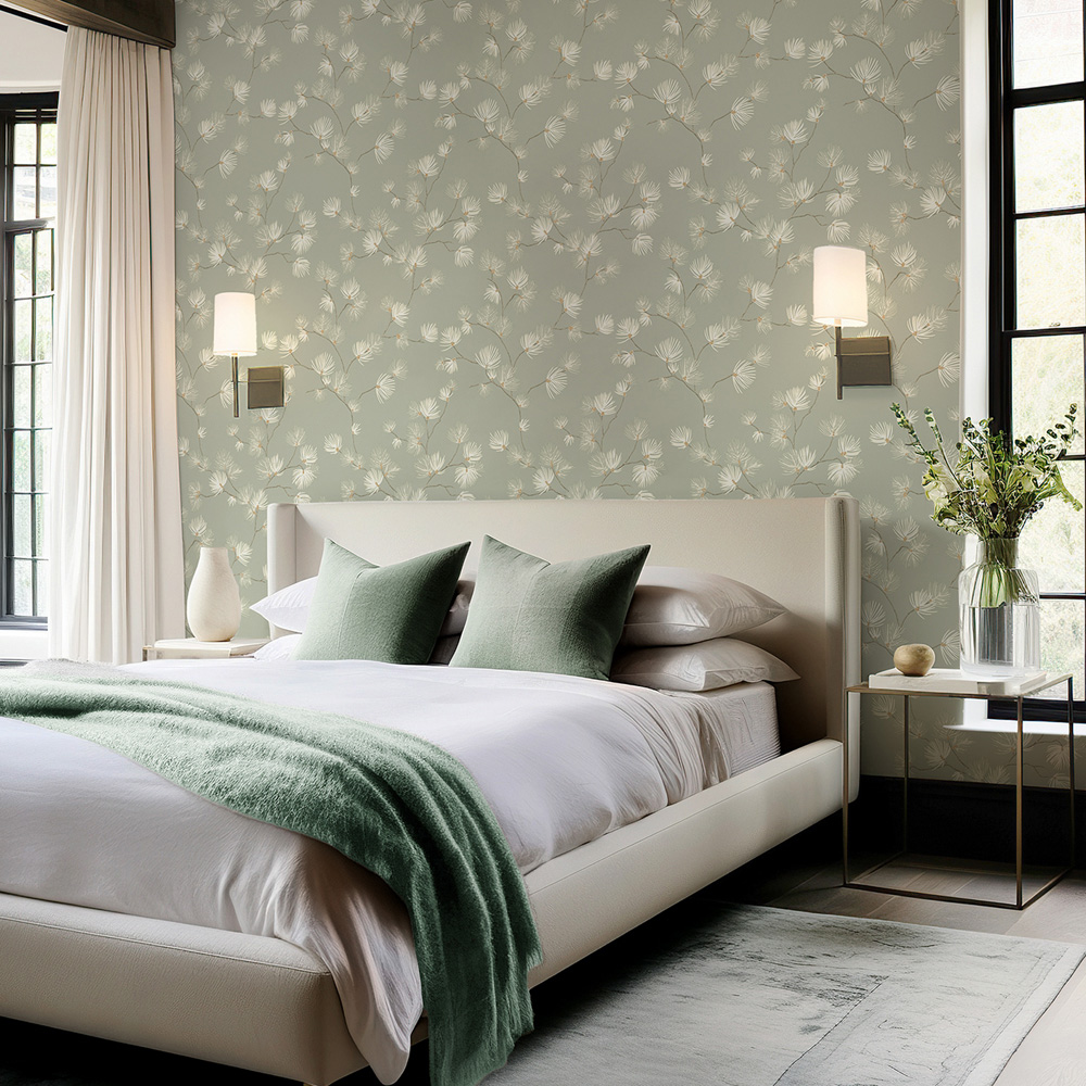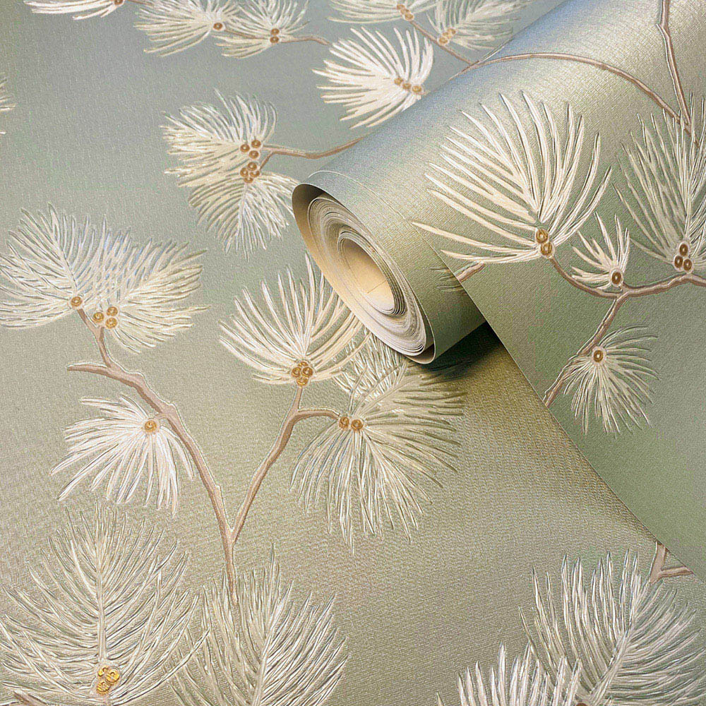 A visually stunning luxury Italian wallcovering collection in a show home colour palette. The established and timeless all-over textured wallcovering resembles fabric studded with small sequins. It provides a beautifully subtle shimmer across the wall elevating any home interior. And the classic light reflective pine leaf trail has a small sequinned centre within each pine leaf. Each trail sits on a rich satin backdrop. The colour palette includes a new mocha colourway, a champagne, and a beautiful soft sage. All Valentino Pine trails coordinate with one or more Valentino textures.