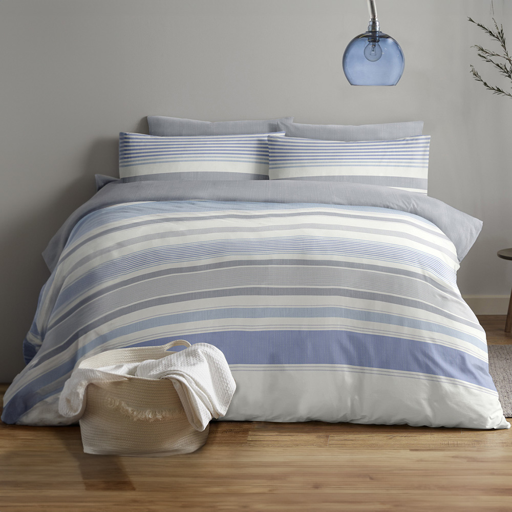 Add a pop of colours to your bed with this Bellissimo Chambray Single Duvet Set. Including a duvet cover and a matching pillowcase, this duvet set features colourful white, grey and blue stripes with a grey reverse to create a classic and clean-looking design. Being made from Easy-care polycotton, it is super soft and machine-washable for easy cleaning! Size: Single.
