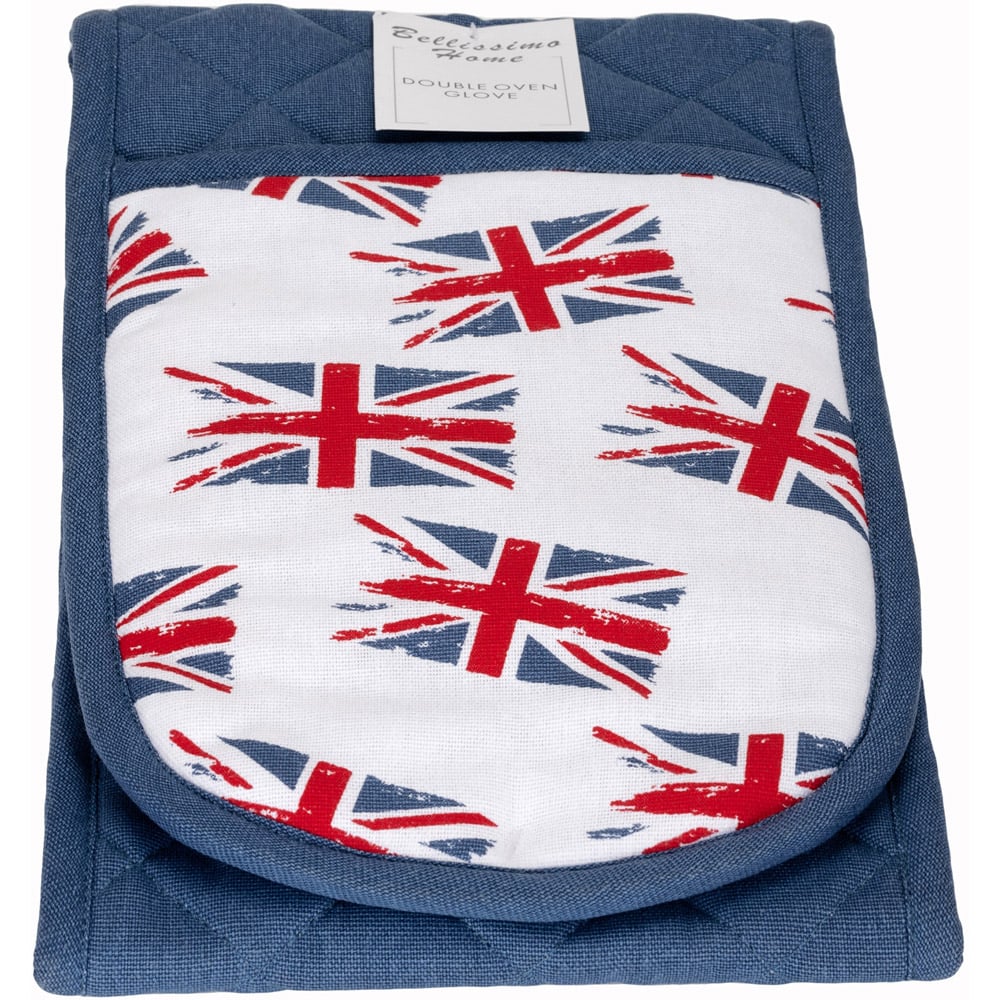Keep your hands safe and clean during cooking with this Bellissimo Double Oven Glove. Complete with a 100% cotton cove, the glove features a navy base with quilting to protect it from heat when using the glove. The front of the glove is white with a small repeating Union Jack flag design.