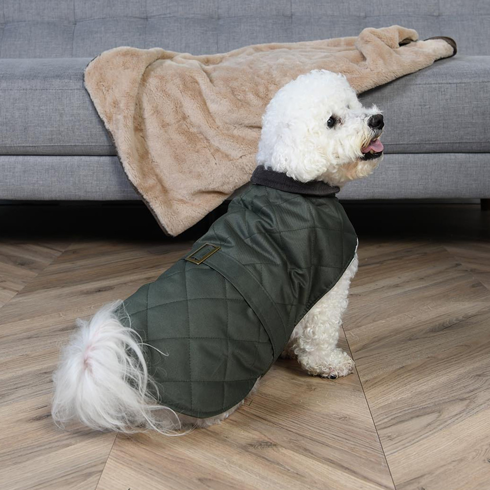 This super stylish Belted Wax Jacket is a great pet accessory for dogs this winter. The coat is made with a wax-coated, water-resistant outer fabric and can be easily adjusted with the hook and loop fastening for a more comfortable fit. It even has a fleece lining for added warmth! This coat is machine washable and can be re-proofed as required - perfect after muddy walks. With a built-in harness hole for convenient use and a cute belt detail, this coat not only looks great but is functional too.