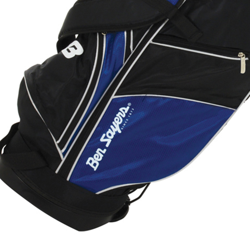 The Ben Sayers Blue M8 Package Set is a comprehensive golf club collection for players. The set includes a 10.5° 460cc oversized titanium matrix driver with matching oversized titanium matrix 3 (15°) and 5 (20°) woods. They feature tactical flight channels and an aerodynamic crown design to improve club head speed and distance. With a low centre of gravity, the set helps promote a high launch angle for increased distance, accuracy and forgiveness. Additionally, the cutting-edge 23° hybrid replaces the longer, harder-to-hit traditional long irons, incorporating an offset hosel to promote straight hitting and eliminate slices. Its classic style, cavity-back, stainless steel irons (5-SW) utilise perimeter weighting and a wider sole with a top line to promote confident ball striking with maximum forgiveness and playability. Also, the new mallet features alignment lines and delivers firm and responsive feedback on every putt. The set has seven to nine spacious pockets, including a velour-lined valuables pocket and an insulated cooler pocket for drinks and snacks. Plus, the 8-way divider top, an umbrella cord, towel carabiner and hook and loop fastener glove holder add convenience. This club collection comes complete with M8 head covers and a top-of-the-range stand bag. Plus, it comes fitted with graphite shafts, and the irons are available with either graphite or steel regular flex shaft options. Model number: G6405.
