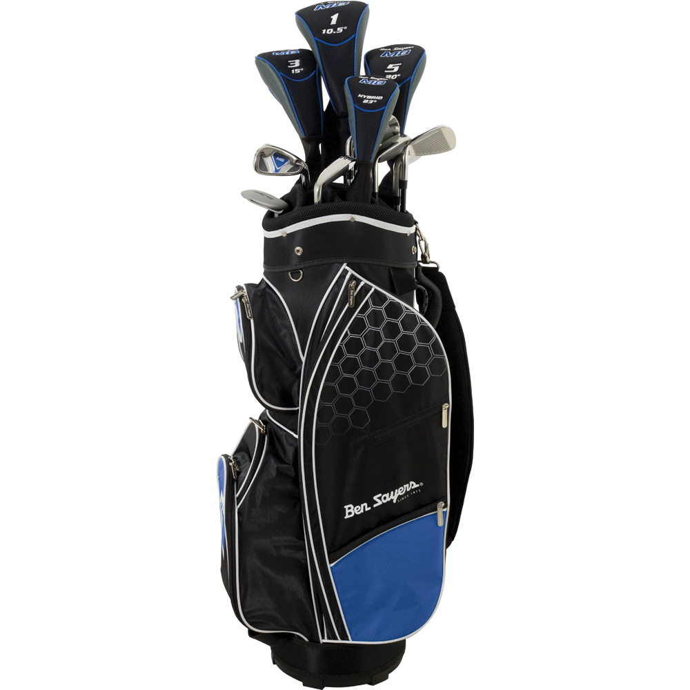 The men’s M8 Package Set from Ben Sayers consists of a 10.5-degree 460cc oversized titanium matrix driver with matching oversized titanium matrix three (15-degree) and five (20-degree) woods, all featuring tactical flight channels and an aerodynamic crown design to improve club head speed and distance. The low centre of gravity helps promote a high launch angle for increased distance, accuracy and forgiveness. The cutting edge 23-degree hybrid replaces the longer, harder to hit traditional long irons, incorporating an offset hosel to promote straight hitting and eliminate slices. The low centre of gravity also helps to promote a higher ball flight, resulting in increased distance and accuracy. All woods and utility clubs come complete with M8 head covers. The classic style, cavity-back, stainless steel irons (5-SW) utilise perimeter weighting and a wider sole and top line to promote confident ball striking with maximum forgiveness and playability. The new mallet putter features alignment lines and delivers firm and responsive feedback on every putt. Plus, the set comes with a blue cart bag offering all the features you would expect from a Ben Sayers bag. It features spacious pockets including a velour-lined valuables pocket and an insulated cooler pocket for drinks and snacks. The eight-way divider top, an umbrella cord, towel carabiner and hook and loop fastener glove holder. All woods come fitted with graphite shafts and the irons are available with either graphite or steel regular flex shaft options.