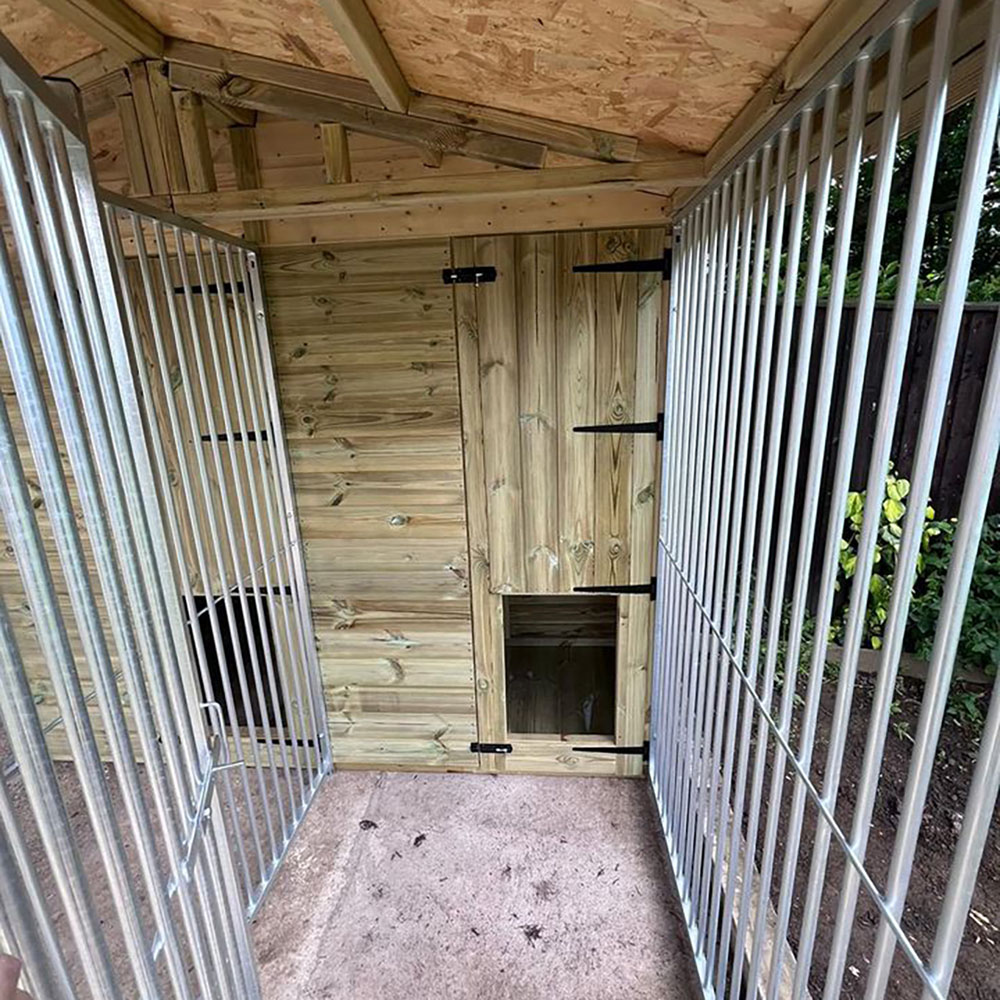 The dog kennel is built for durability and is designed to withstand wear and tear. It is made from sturdy materials, providing a comfortable and secure place for your dog to rest. The framework consists of tanalised 45 x 45mm pressure-treated timber, and the cladding features 12mm thick tanalised tongue and groove shiplap. The roof is constructed from structurally sound OSB 3 sheets.