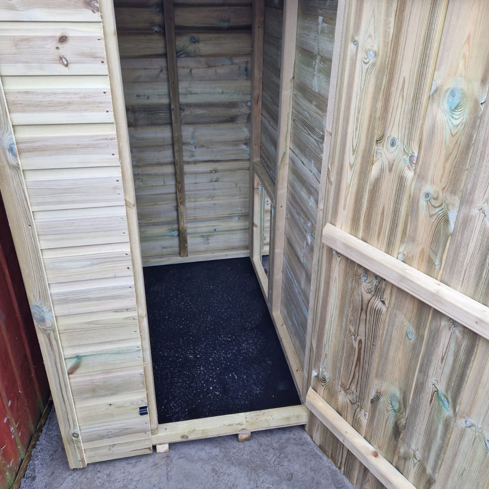 The dog kennel is built for durability and is designed to withstand wear and tear. It is made from sturdy materials, providing a comfortable and secure place for your dog to rest. The framework consists of tanalised 45 x 45mm pressure-treated timber, and the cladding features 12mm thick tanalised tongue and groove shiplap. The roof is constructed from structurally sound OSB 3 sheets.