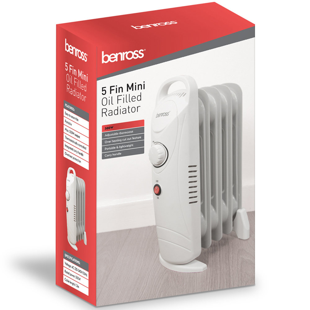 Bring an instant burst of warmth into any specific room in your home, office, or any other space where you want some heat with the Benross 5 Fin Mini Oil Filled Radiator 500W. The radiator is quick and easy to set up and use, making it ideal for those cold winter evenings. It has a maximum power of 500W and features five fins to diffuse heat throughout the room. The heater is specifically designed to heat the room and keep household bills low. Based on the October energy price cap of 34p p/kWh, the radiator will cost you around 17p per hour to run. This electric radiator has a 1.2m cable length and features a one-touch switch to turn it ON. It also features a cool-touch carry handle, making it easy to transport from room to room. The temperature of this portable radiator is simple to control. Turn the thermostatic dial on the radiator, and use the scale from low to high to set the ideal temperature you desire. The radiator has a built-in overheat protection, so if the temperature gets too hot, the power will cut off, providing peace of mind in the process.