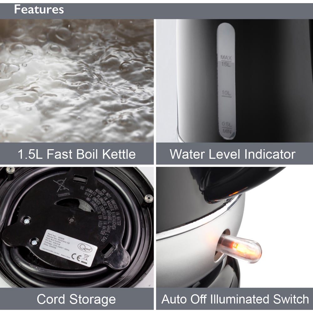 Make a stylish addition to any kitchen with a Benross Black and Silver 1.5L Fast Boil Kettle. With a 1.5L capacity cordless jug, this fast-boil kettle can make up to six cups at once, making it a great choice for family homes or small offices – perfect for everyday use. For your peace of mind, this kettle is BPA-free. The kettle base moves 360 degrees and includes handy cord storage to keep your worktops tidy and fuss-free. Combining modern design with practical performance, this kettle has a 1.5L capacity. The spout has a removable and washable filter, which makes the kettle easy to clean and maintain, keeping it working to its highest performance. It has a hinged lid for easy filling, a convenient illuminated power indicator, and an automatic cut-off for safety. With a transparent fill window, you can easily see and measure how much water you are putting in the kettle while filling it to avoid waste.