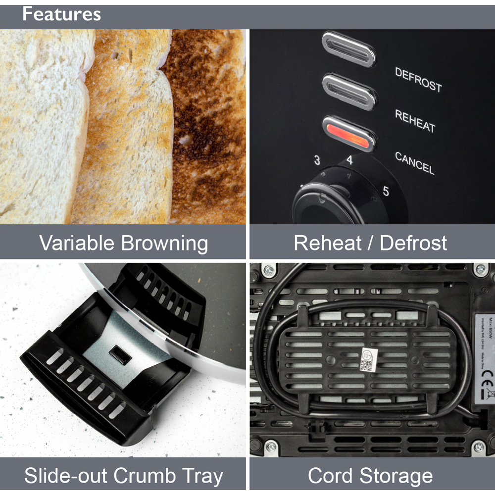 Upgrade your breakfast game with this Benross Black and Silver 2 Slice Toaster, a sleek 850W toaster. Its wide slots make it perfect for toasting sliced bread, crumpets, and bagels. The auto-centring feature ensures that your toast is evenly browned, without any white edges. With seven variable browning settings, you can get your perfect-coloured toast every time. The reheat function lets you warm up toast that has cooled down, while the defrost button allows you to toast bread straight from the freezer. The removable crumb tray makes cleaning a breeze, and the integrated cord storage keeps your countertops clutter-free. For your safety, the toaster is cool to touch with non-slip feet and has an anti-jam function for easy toast removal. Dimensions: 18.4 x 28.2 x 18.9cm.