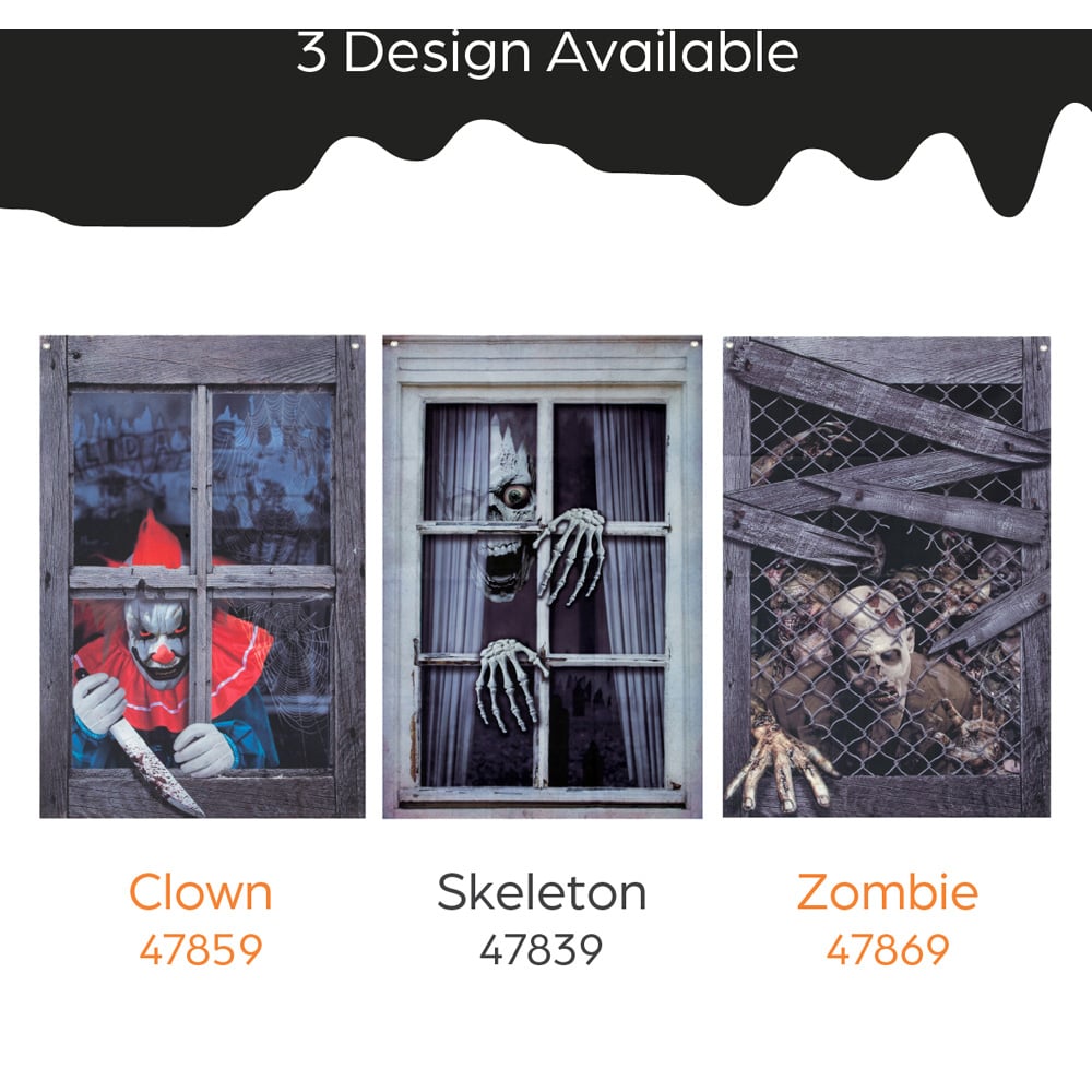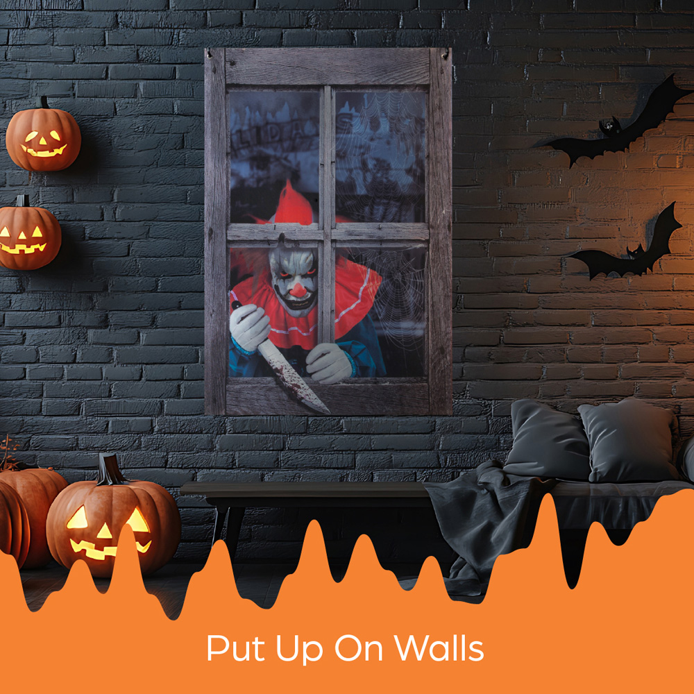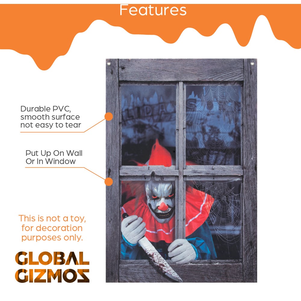 Scare trick-or-treaters, party guests, and more with this creepy Halloween Window Display! It features a scene of a creepy killer clown holding a bloodstained knife, looking out of the window, and evoking images of classic horror films. The one-sided display is easy to install, as it features a hanging hole in each of its four corners, and also comes with an included backdrop made from durable PVC. The poster measures 120cm high by 80cm wide, making it the perfect size for fitting in front windows for passers-by to see.
