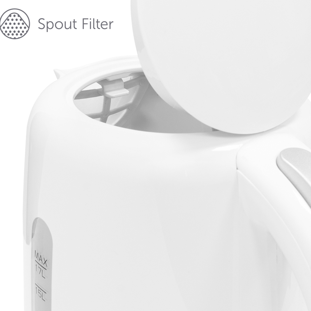 Start your day off right with this Benross White and Silver Fast Boil 1.5L Kettle. This fast-boil kettle has a 1.5-litre capacity cordless jug that can make up to six cups at once, making it perfect for family homes or small offices. It is BPA-free, ensuring your peace of mind. The kettle base moves 360 degrees and includes cord storage to keep your worktops tidy. It has a modern design and practical performance, making it a stylish addition to any kitchen. The spout has a removable and washable filter, making it easy to clean and maintain. It has a hinged lid for easy filling, an illuminated power indicator, and an automatic cut-off for safety. The transparent fill window allows you to easily see and measure how much water you are putting in the kettle while filling it to avoid waste. Dimensions: 15.4 x 22.2 x 23.3cm.