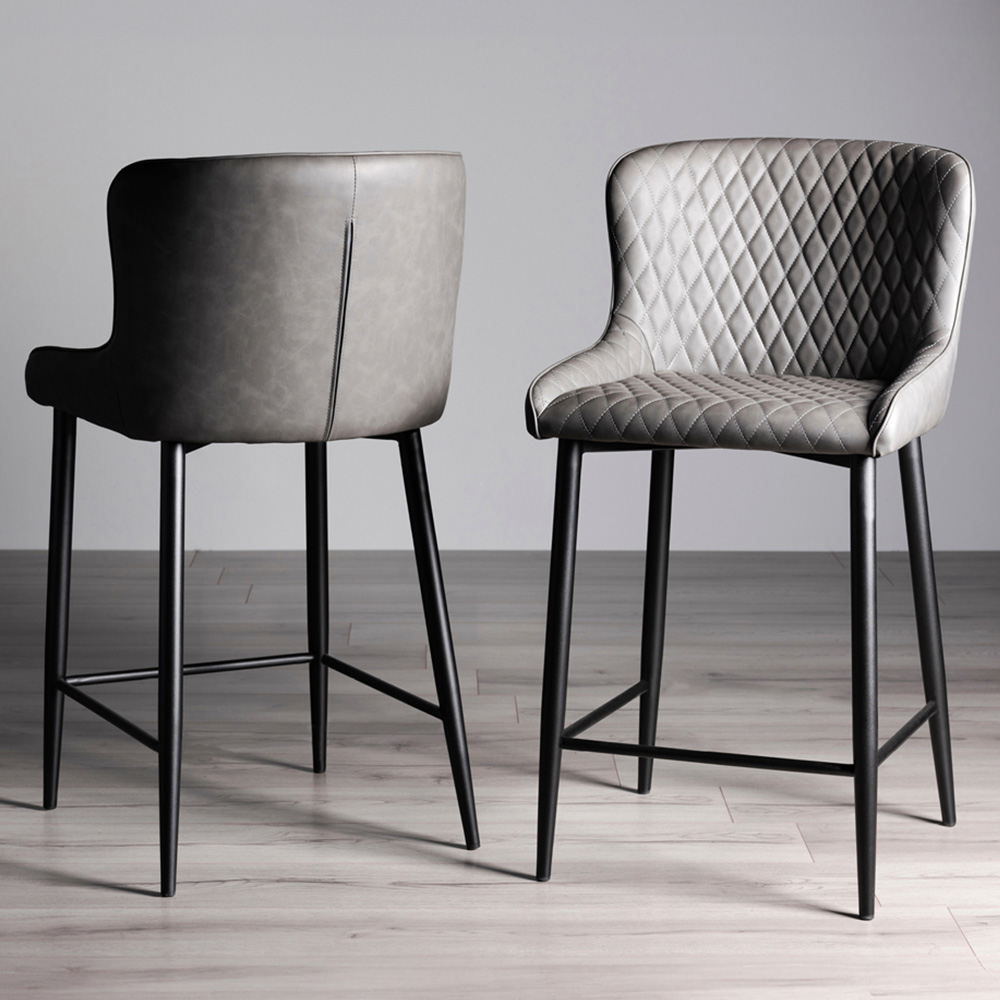 Grand comfort meets refined detail with Bentley Designs Cezanne Set of 2 Dark Grey Faux Leather Upholstered Barstool. The Cezanne bar stool pairs diamond-quilted dark grey faux leather with sleek sand-black tapered legs. Curved seating and premium upholstery make it a standout in any kitchen or dining bar. 2-year warranty included.