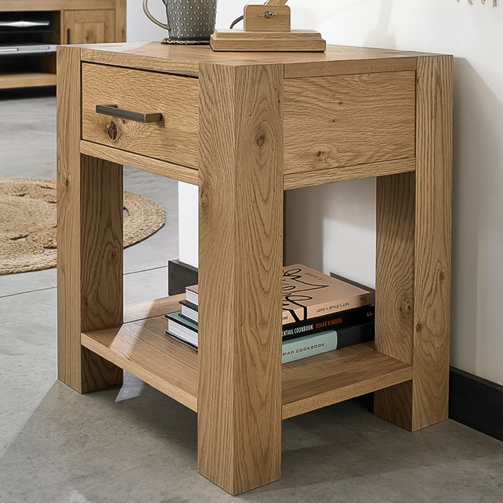 This lamp table is a stunning blend of bold design and cosy charm. Crafted with meticulous attention to detail, this exquisite piece showcases a rich, Light-oiled oak construction that exudes warmth and sophistication. The soft-close drawer operates smoothly, effortlessly combining practicality with elegance, while the open shelf below provides ample space for books, decor, or your favourite collectables. With its harmonious walnut accents, the Turin lamp table elevates any living space, seamlessly marrying stylish functionality with timeless appeal.
