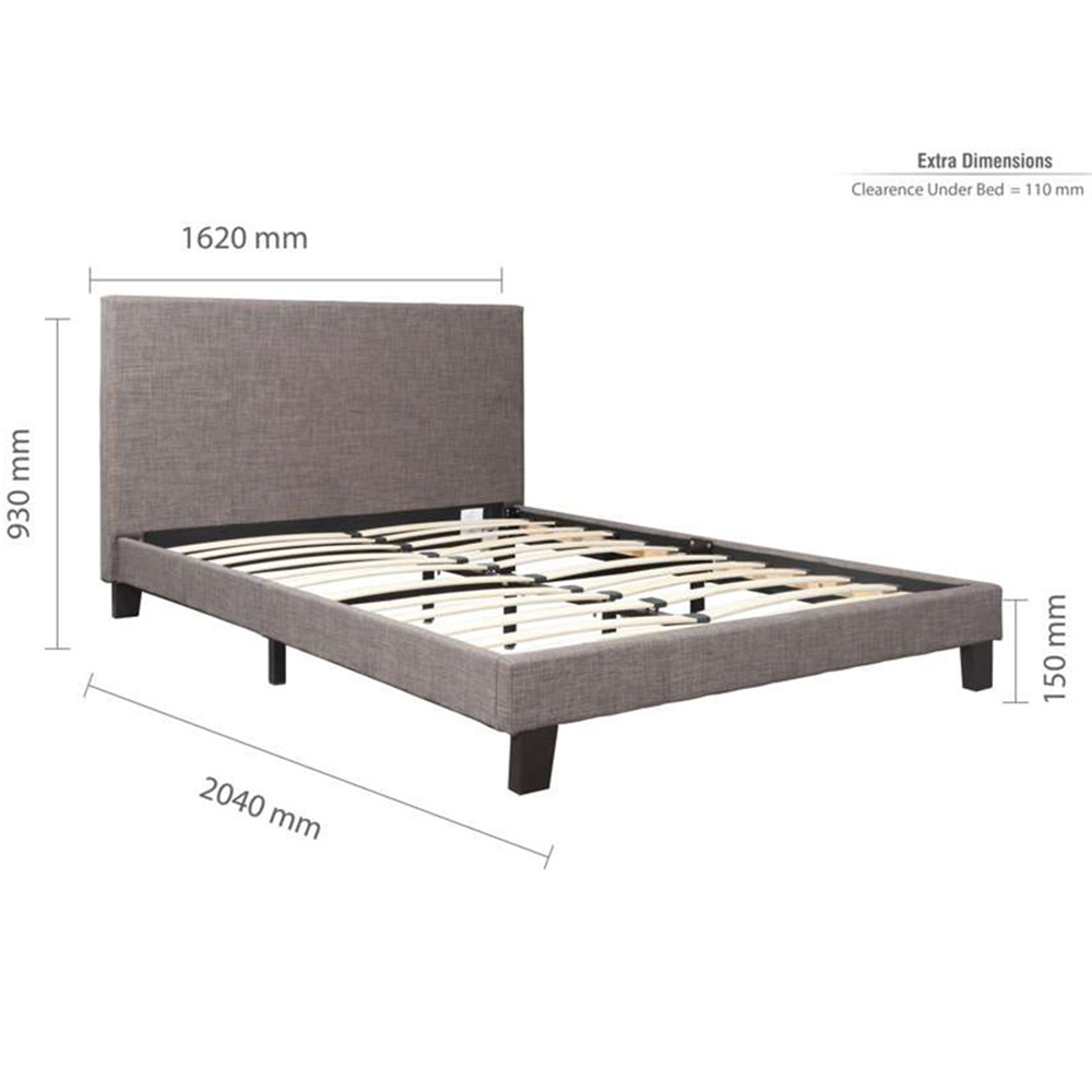 Elevate your nights to a realm of tranquillity and style with this Berlin King Size Grey Polyester Bed. Modern and stylish, the bed offers comfort with its luxury fabric finish, adding a touch of class to the bedroom. It is upholstered in polyester with complementary dark feet and has a sprung slatted base with natural bounce, adjusting to where pressure is most exerted to provide greater comfort. Please note: The bed is only suitable for a UK standard-size mattress, and the recommended maximum mattress height is 250mm. Maximum weight load: 200kg.