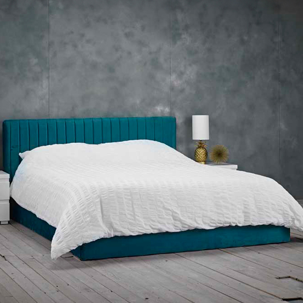Elevate your decor with this LPD Furniture Berlin King Size Teal Bed Frame. The Berlin bed is not just stylish but a classic choice that blends with most decor styles. This bed will give your room that chic hotel vibe, and it is available in a choice of teal, silver or mustard velvet. Also, with the added bonus of an ottoman lift to reveal a great under-bed storage area, the Berlin really does tick all the boxes. Please note: This product is suitable for use with king-size mattresses. Check dimensions for ideal outcomes. Also, the bedding in the image is only for illustration purposes (not included).