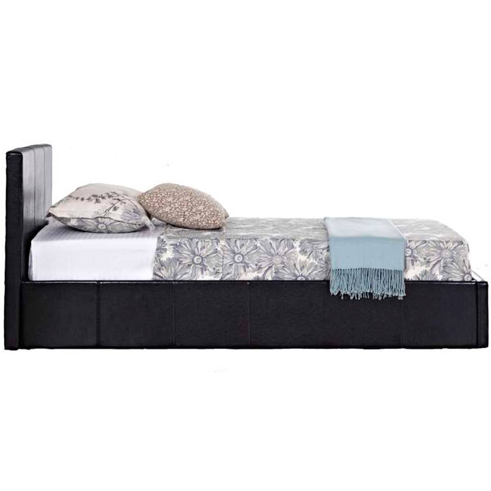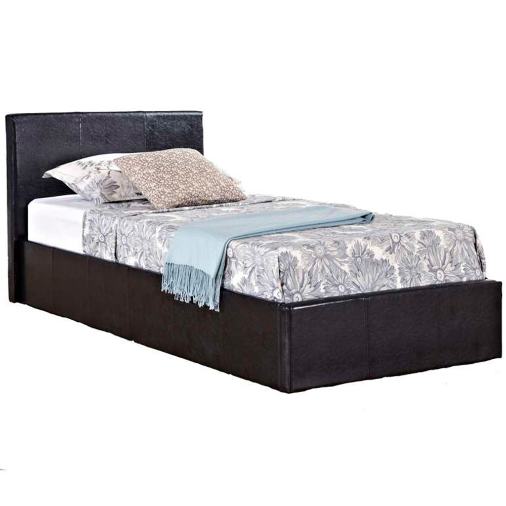 Discover the art of relaxation with this Berlin Single Brown Faux Leather Ottoman Bed. A contemporary statement design, the bed features luxury faux leather upholstery complemented by dark wooden feet. It has a sprung slatted base to give natural bounce, adjusting to where pressure is most exerted for greater comfort. Please note: The bed is only suitable for a UK standard-size mattress, and the recommended maximum mattress height is 250mm. Maximum weight load: 150kg.