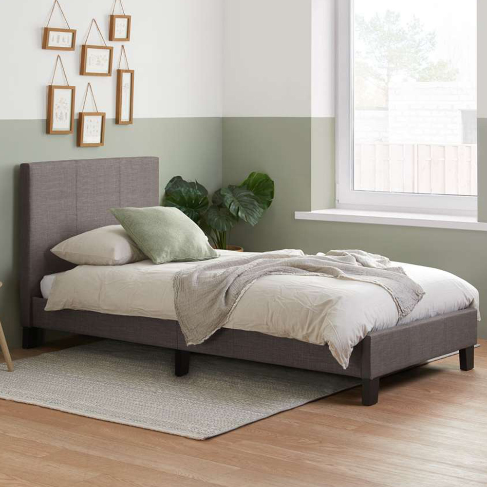 Elevate your nights to a realm of tranquillity and style with this Berlin Small Double Grey Polyester Bed. Modern and stylish, the bed offers comfort with its luxury fabric finish, adding a touch of class to the bedroom. It is upholstered in polyester with complementary dark feet and has a sprung slatted base with natural bounce, adjusting to where pressure is most exerted to provide greater comfort. Please note: The bed is only suitable for a UK standard-size mattress, and the recommended maximum mattress height is 250mm. Maximum weight load: 200kg.