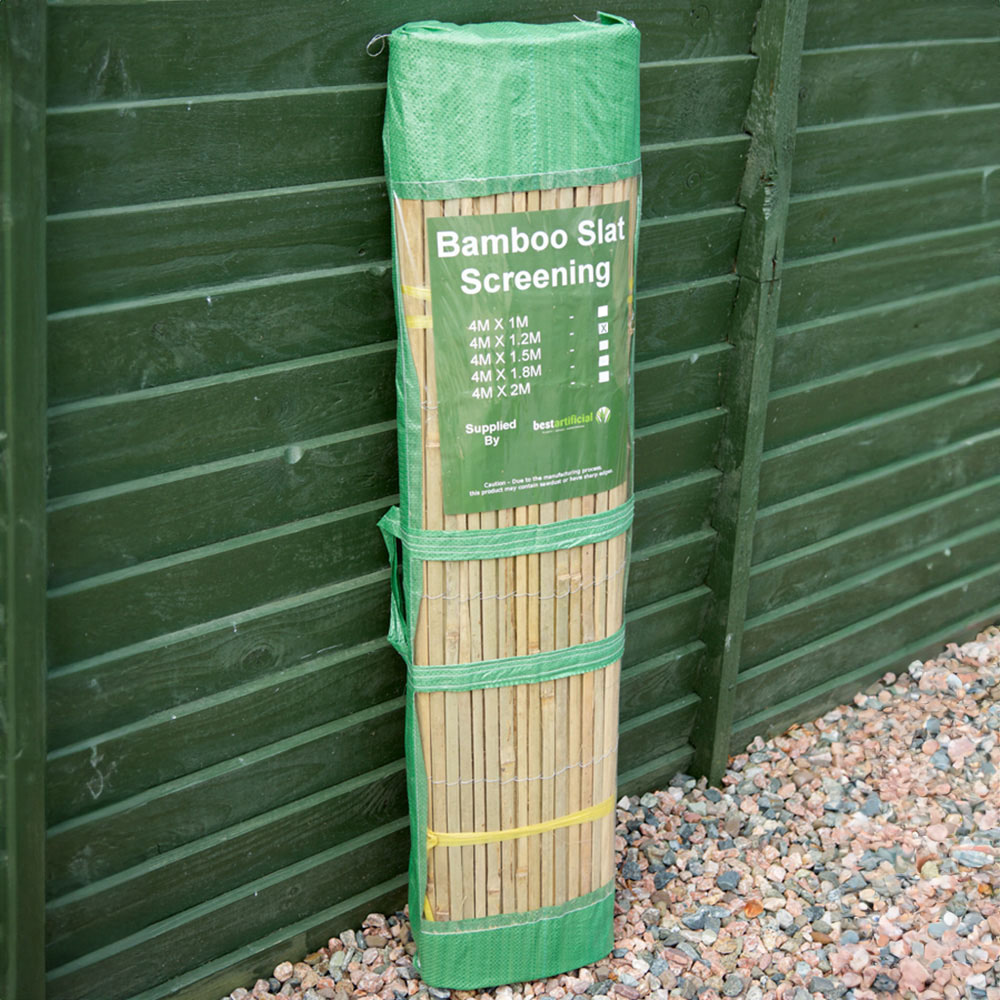 Transform your garden or patio with the Best Artificial 4 x 1.2m Bamboo Screening, a beautiful bamboo split slat screening roll. Hide an unsightly fence or create a stunning focal point in your outdoor area. Every roll features uninterrupted bamboo slats in different widths and colours. You can attach it to existing walls or fences using galvanized wire, cable ties, or screws/nails. Installation is a breeze, and the rolls can be easily fastened to walls or fences. Please note that the bamboo is not self-supporting and should be affixed to a surface.