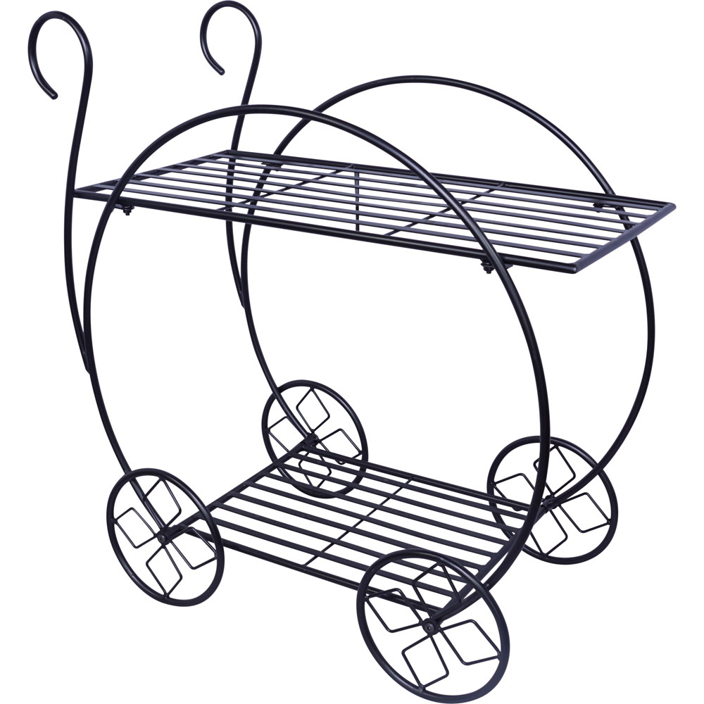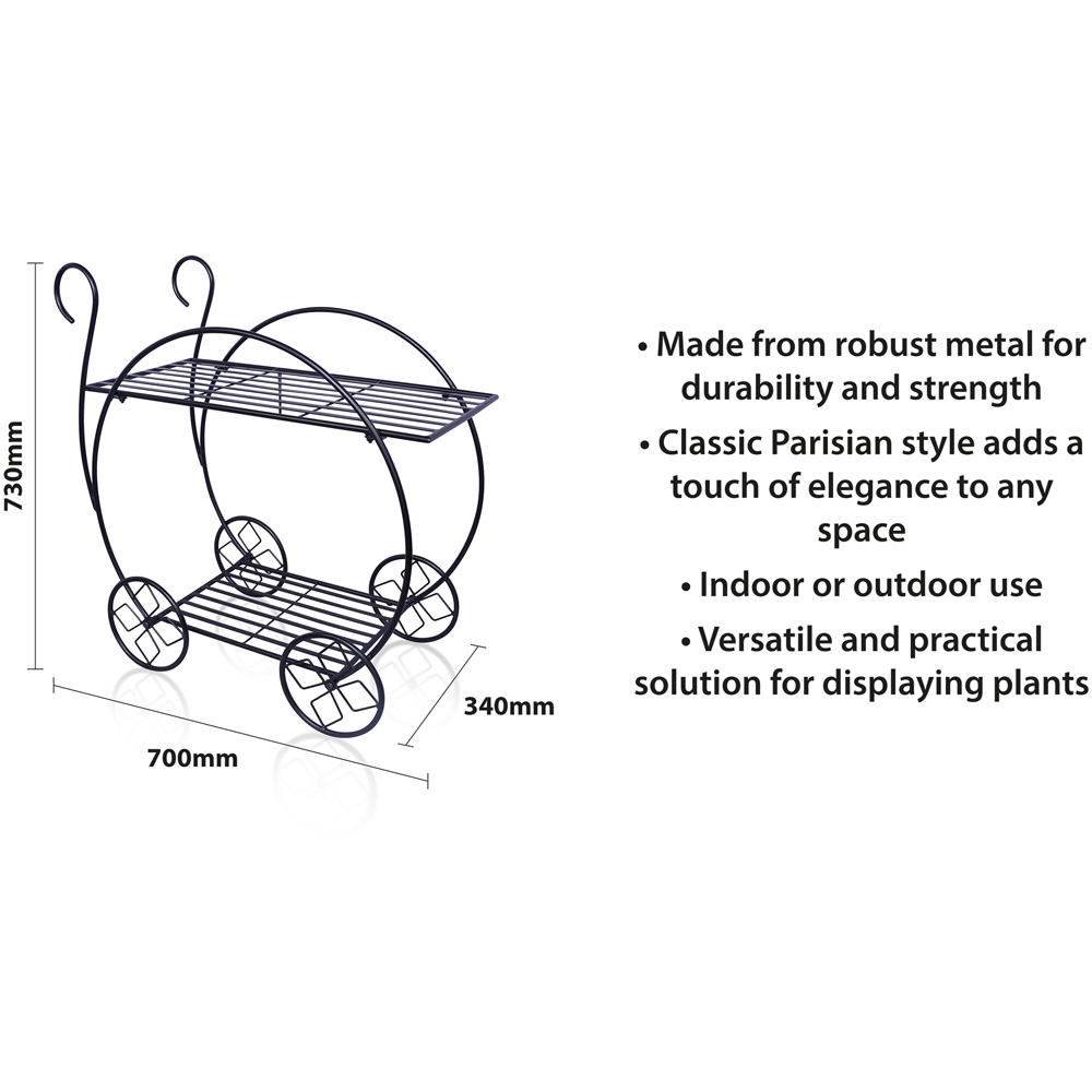 Go for a stylish and practical way to display your plants both indoors and outdoors with the Best4 2-Tier Black Metal Garden Plant Stand. The metal decorative garden cart with wheels in classic French Parisian style is the perfect solution to elevate your outdoor oasis. This beautiful cart stand is made from robust metal and features a classic French Parisian style that is sure to add a touch of elegance to any space. With its decorative wheels, this cart stand is incredibly versatile and can be used indoors and in outdoor spaces, including patios, yards, lawns, hallways, and conservatories. The pot holder can hold a variety of plants, and the height of the cart stand allows for maximum sunlight exposure, which is especially important for plants that require more sunlight to thrive.