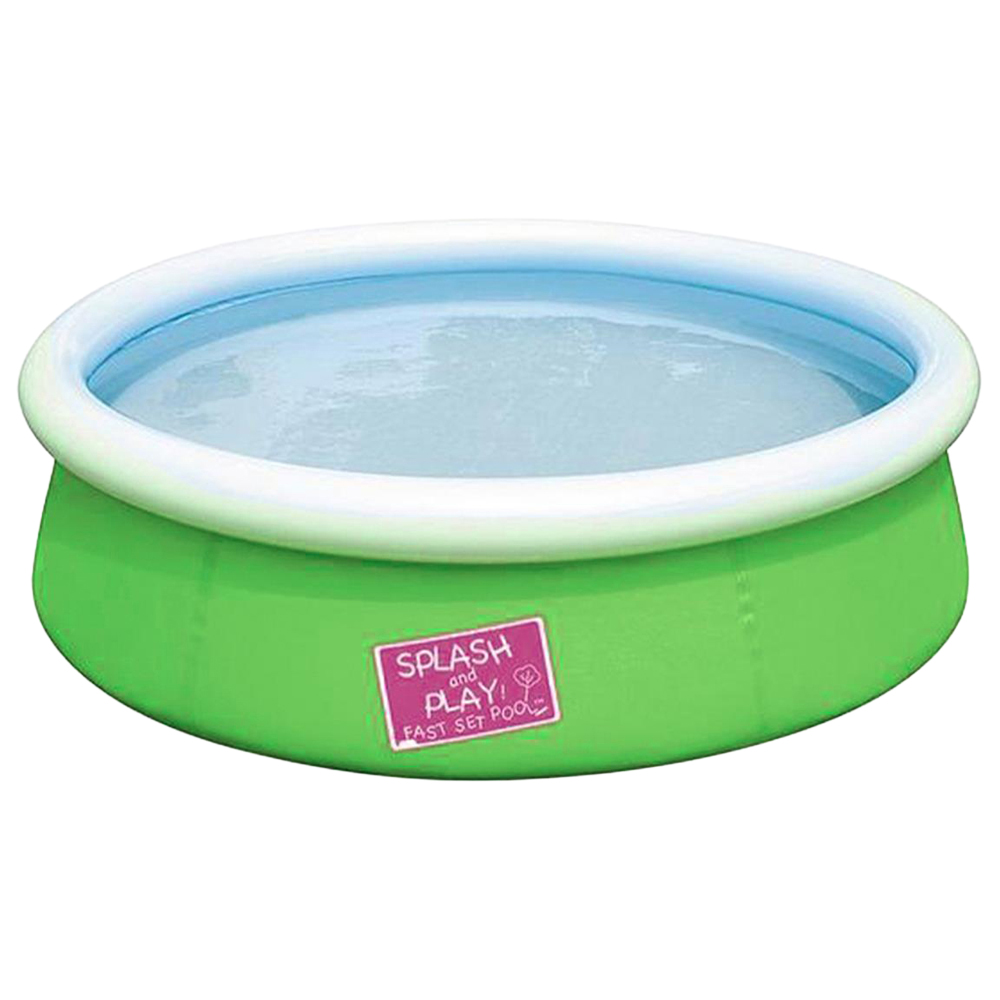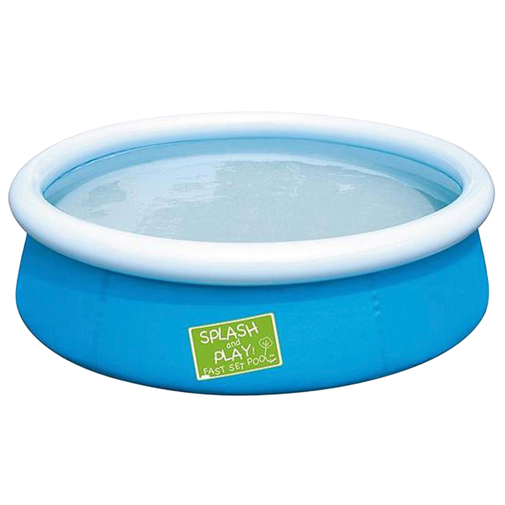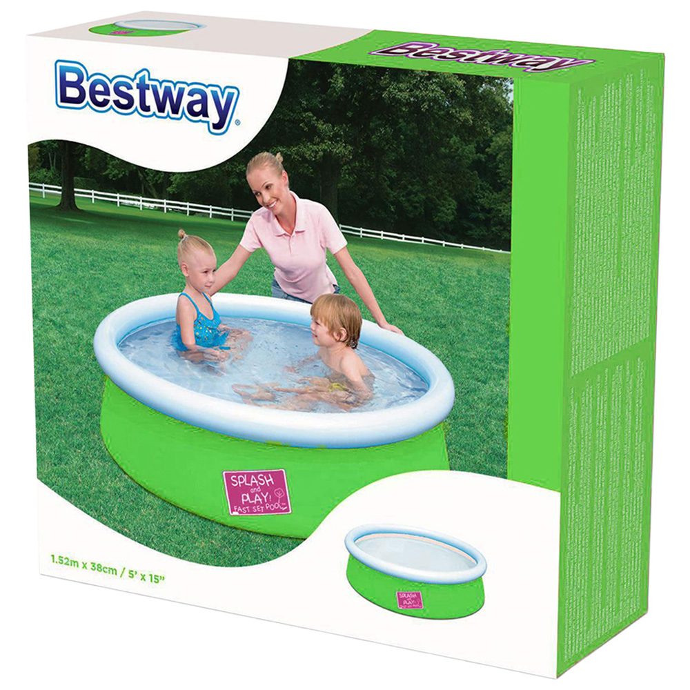 Bestway Mini Ground Pool for Children with Repair Patch, 152 x 38cm, Bestway My First Fast Set Pool provides young children with a safe place to have splashing fun and practice paddling. It's also a practical paddle pool for parents because it's extremely easy to set up. Apart from an air pump, the paddling pool requires no tools whatsoever. Once a flat, solid surface has been found it's a simple case of inflating the white upper ring and filling the base with water. As the shell of the splash pool fills with water it broadens out and rises. Once it has reached its capacity children are free to clamber in and have a splash. The shell of the Bestway My First Fast Set Pool is made of hardwearing PVC and polyester, ensuring watery fun for many a sunny season. A set-up and maintenance DVD also comes included. Adult supervision is required when children are in and around pools and water.