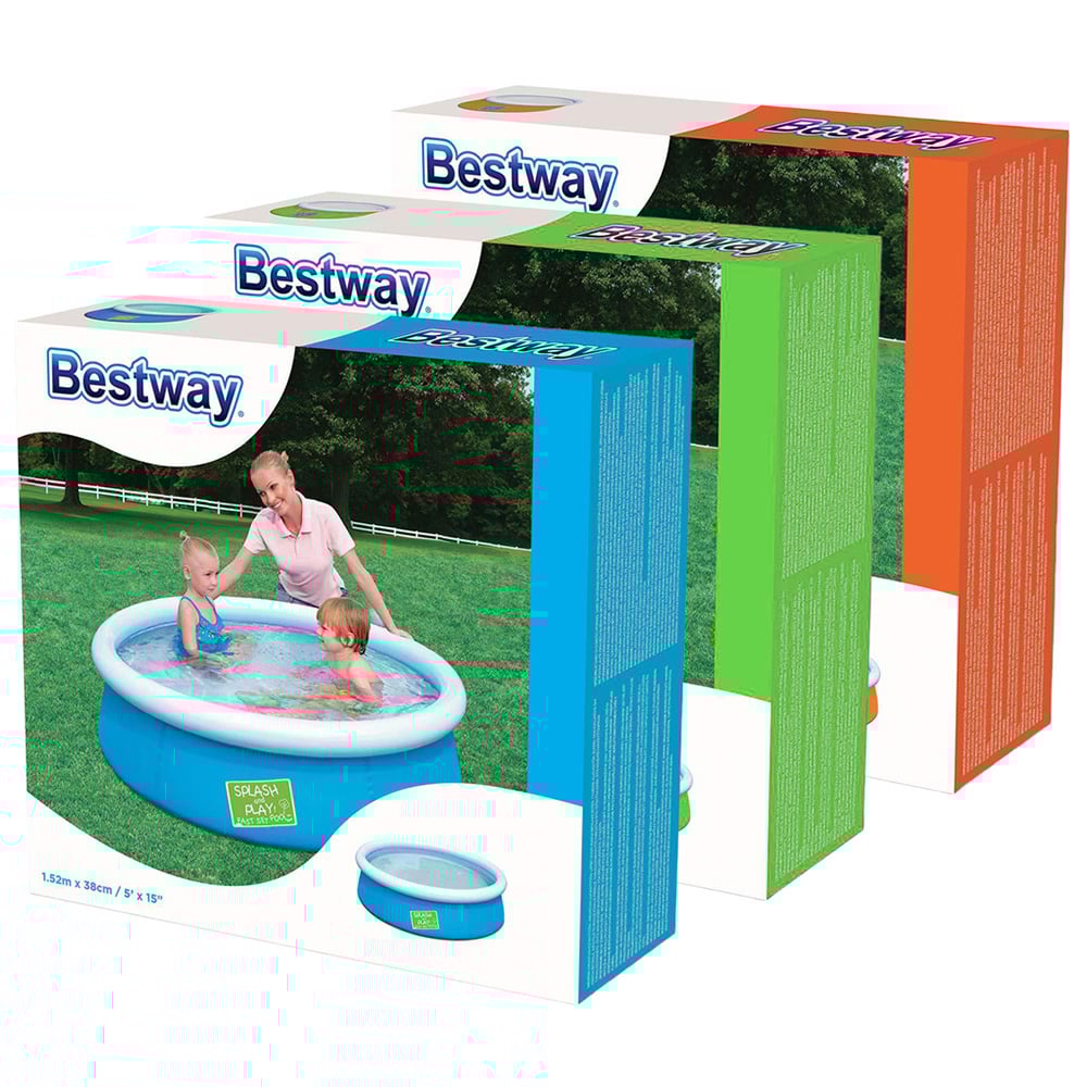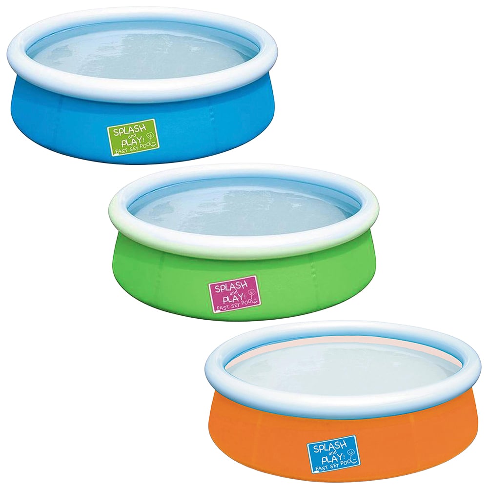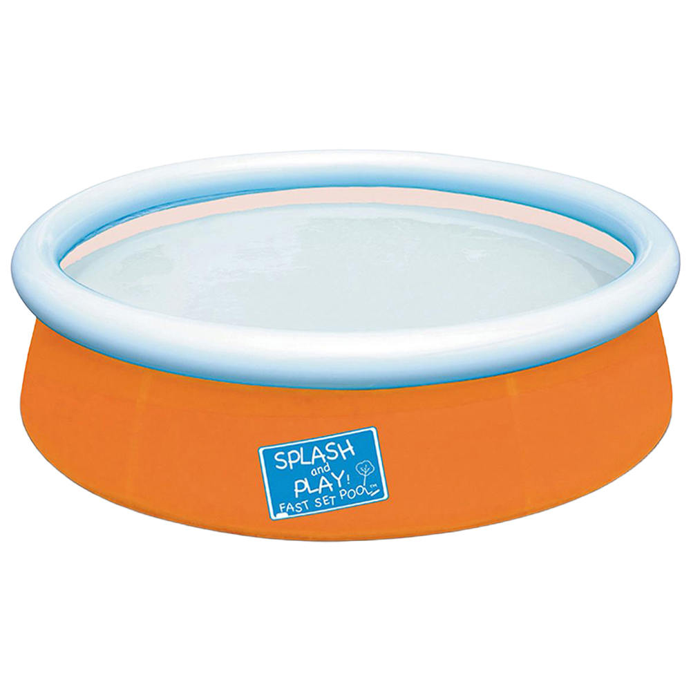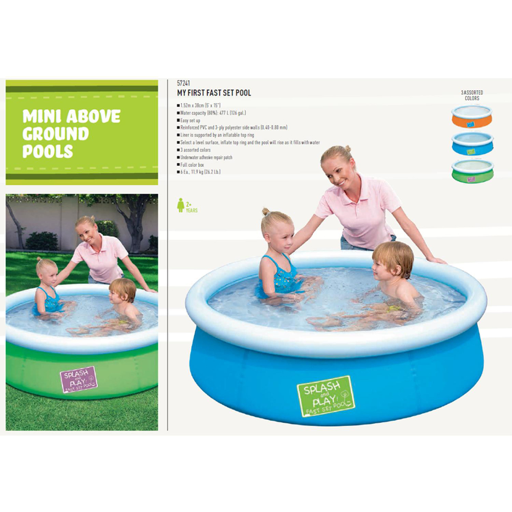 Bestway Mini Ground Pool for Children with Repair Patch, 152 x 38cm, Bestway My First Fast Set Pool provides young children with a safe place to have splashing fun and practice paddling. It's also a practical paddle pool for parents because it's extremely easy to set up. Apart from an air pump, the paddling pool requires no tools whatsoever. Once a flat, solid surface has been found it's a simple case of inflating the white upper ring and filling the base with water. As the shell of the splash pool fills with water it broadens out and rises. Once it has reached its capacity children are free to clamber in and have a splash. The shell of the Bestway My First Fast Set Pool is made of hardwearing PVC and polyester, ensuring watery fun for many a sunny season. A set-up and maintenance DVD also comes included. Adult supervision is required when children are in and around pools and water.