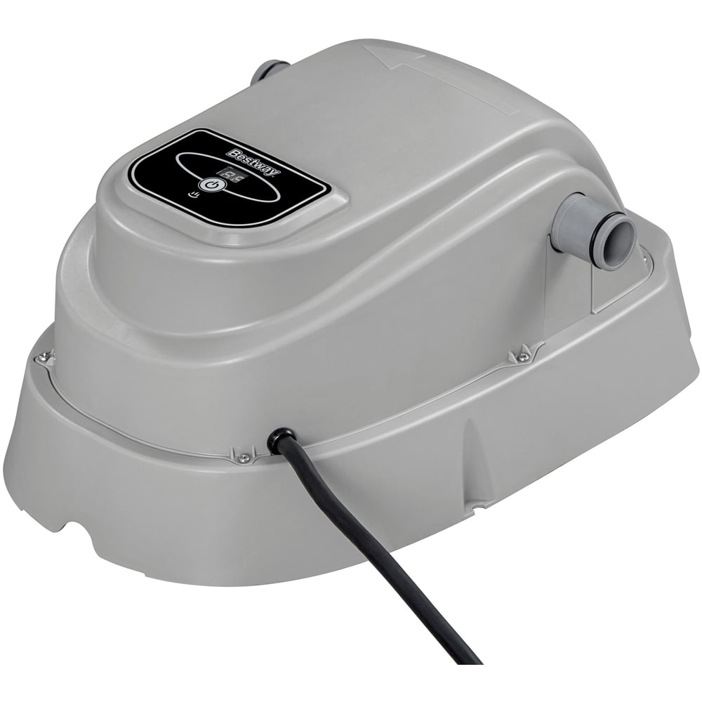 Create a warm and inviting atmosphere for swimming, lounging, and playing with the Bestway Pool Heater. This outdoor pool heater is designed for use with Bestway pools and is compatible with sand and filter pumps with a capacity of 1000 gallons or less. The electric pool heater features two hose outlets: one connects to a filter pump and the other to your above-ground pool. The heater receives clear water from the filter pump, heats it, and then returns it to the pool. This swimming pool heating system is suitable for use with filter pumps and sand filters with a flow rate of 1000 gallons per hour (3785 litres) or less. Additionally, the pool heater comes with a four-meter power cord for easy connection to an electrical outlet, along with all the necessary hoses and attachments for a quick and simple setup. Depending on your pool's size and your desired temperature, the pool heater can take anywhere from 12 hours to 3 days to warm the water, increasing the temperature by approximately 0.5°C to 1.5°C per hour. It's important to note that the pool heater does not include a thermostat for adjusting the temperature setting. This product is compatible with pool water capacities ranging from 1520 to 17,035 litres (400 to 4500 gallons) or for pools up to 15 feet in size. It is also compatible with filter pumps with flow rates of up to 3785 litres (1000 gallons) per hour. The pool heater features a water sensor power switch and a temperature control panel with an on or off button. This heater is an essential addition to create an enjoyable above-ground pool experience.