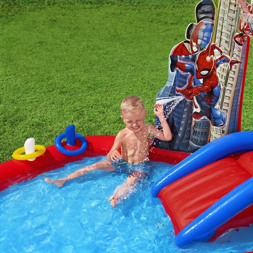 Provide an interactive and exciting play experience for your children with the Bestway Spiderman Play Centre and Pool. Whether it's used with or without water, this play centre offers year-round fun. The built-in slide, securely welded to the bottom of the pool, ensures that children can land and splash safely. Additionally, the superhero ring toss game and ball ramp with six play balls provide endless entertainment for children, making it an ideal choice for hours of playtime. The archway water sprayer can be easily attached to a garden hose for a quick and convenient setup, ensuring that children can start having fun in no time. Dimensions: 6.11ft x 6.9ft x 50 inch). Suitable for ages two years and above.