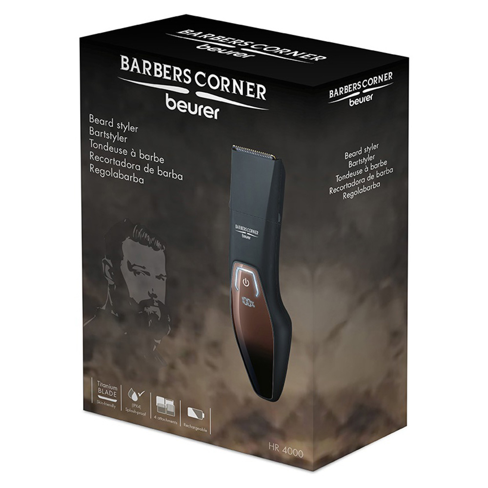 Trim and shape your beard to perfection with the Beurer Barbers Corner Beard Trimmer. Featuring a powerful lithium-ion battery – it gives you an hour of cordless shaving time. The high-quality stainless steel blades glide through hair effortlessly while the titanium coating cares for your skin if you're opting for the clean-cut look. It also comes with four attachments – a long comb (for lengths 15-27mm), short comb (for lengths 1-12mm), slim contour blade (for precise styling), slim contour blade comb (precise styling at lengths 1, 3 and 5mm), and includes a storage bag.