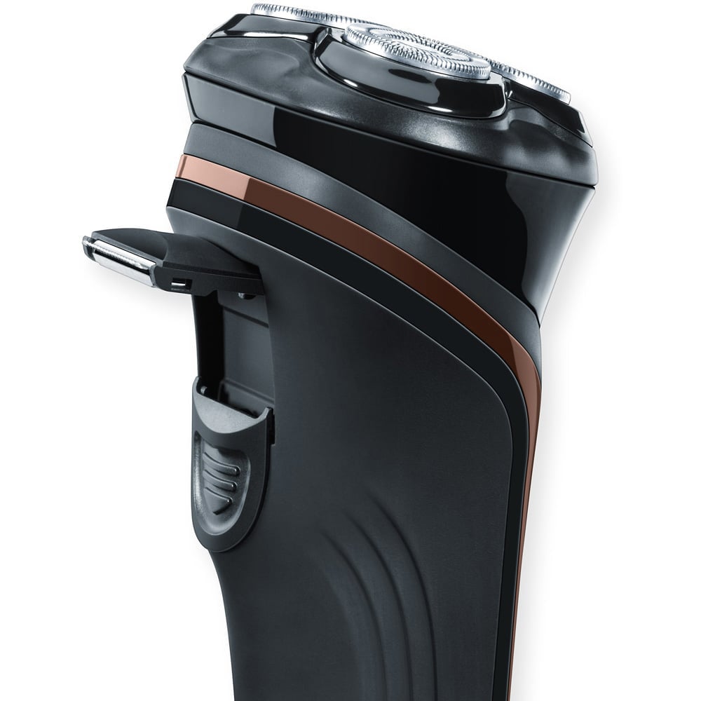 Trim or shave your beard evenly or effortlessly with the Beurer Barbers Corner Rotary Shaver. Featuring three spring-loaded dual-ring shaving heads - this rotary shaver glides over your chin and jawline to trim or shave your beard with ease. For the finer detail, flip open the pop-up contour trimmer for a perfect finish. Powered by a lithium-ion battery - it gives an hour of cordless shaving time to shape the beard to perfection.
