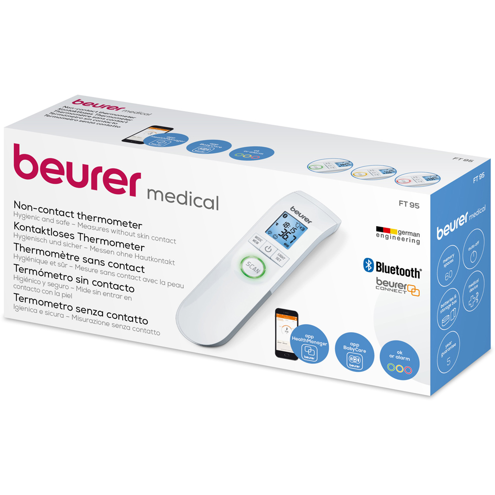 Fever measurement is made easy with this Beurer FT 95 Non-Contact Thermometer. With this thermometer, you can always keep track of your temperature. You can transfer this data to the beurer HealthManager Pro and beurer Baby Care app using Bluetooth to track details. Moreover, these applications give you a clear overview of all of your results in one place. This thermometer comes with a sound control and displays measurements in Celsius and Fahrenheit. It records the temperature from a distance of 2 to 3cm.