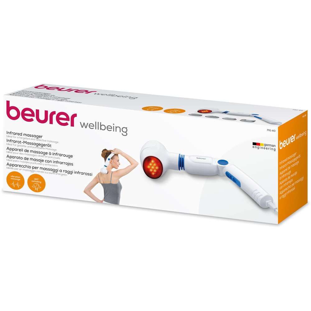Soothe sore muscles with this Beurer MG 40 Infrared Rotating Head Massager. This massager offers a deep and penetrating vibration massage for targeted relief from aches, pains and tension. It comes with four interchangeable attachments including a brush attachment, two nub attachments and a cone-shaped attachment offering a versatile massage suitable for relaxation and recovery. Moreover, the innovative handle bends and rotates making self-application so easy you can benefit from a relaxing massage at any time.