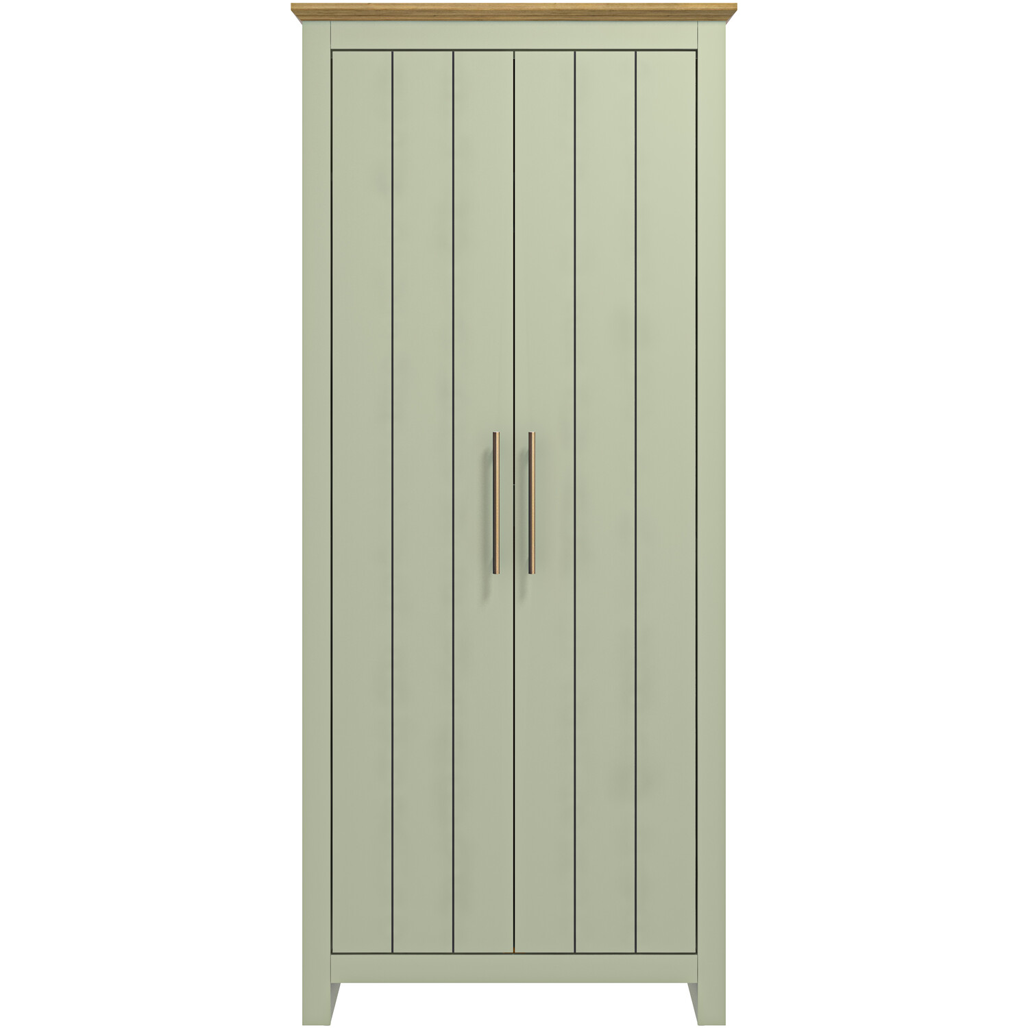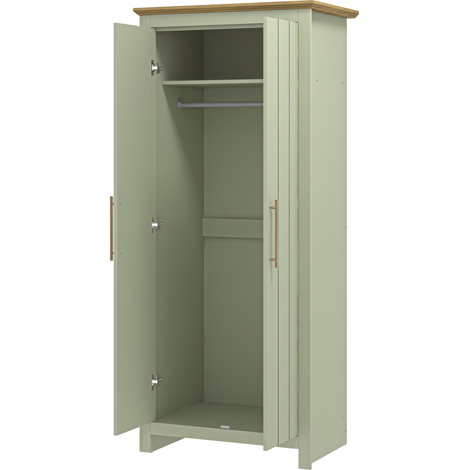 A beautiful addition to your bedroom, this Bexley 2-Door Wardrobe features a stylish and modern sage green finish with copper handles for a contemporary feel. A sturdy oak-effect finish on top finishes this piece off to create an expensive-looking item for a fraction of the price. It has a storage shelf for accessories and a sturdy rail for all your clothes. It will look wonderful in any bedroom.