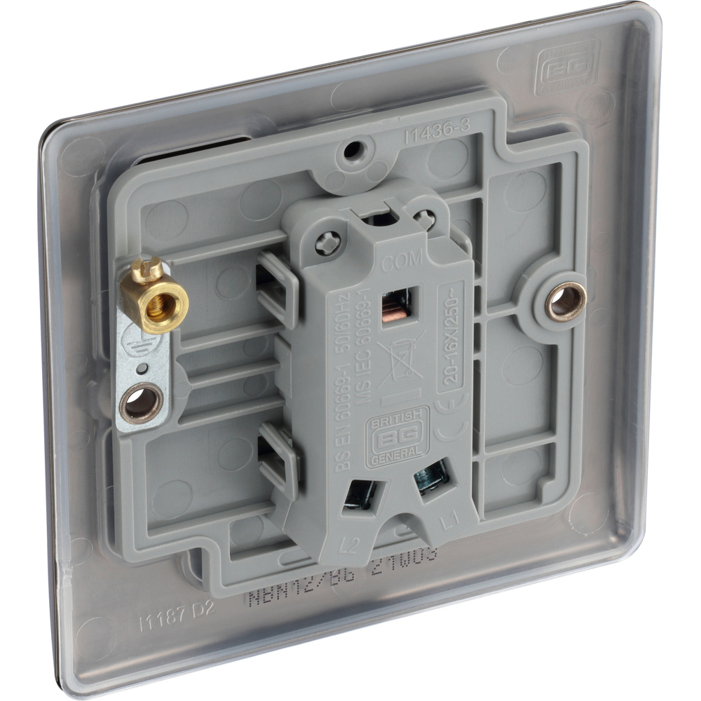 Go for the perfect power accessory with the BG Nexus 2 Way 20A Black Nickel Single Switch 5 Pack. These single light switches come in a pack of five and feature a sleek, raised design with gently rounded edges. They include colour-matching screws and allow for two-way switching, enabling the addition of a second switch position in a circuit. This feature makes it possible to have multiple switches controlling the same light from different locations, such as the landing or hallway. The switches are equipped with a moisture control gasket to prevent tarnishing, and the captive, backed-out terminal screws allow for quick and easy installation. With their high quality and stylish design, they make a great addition to any decor.