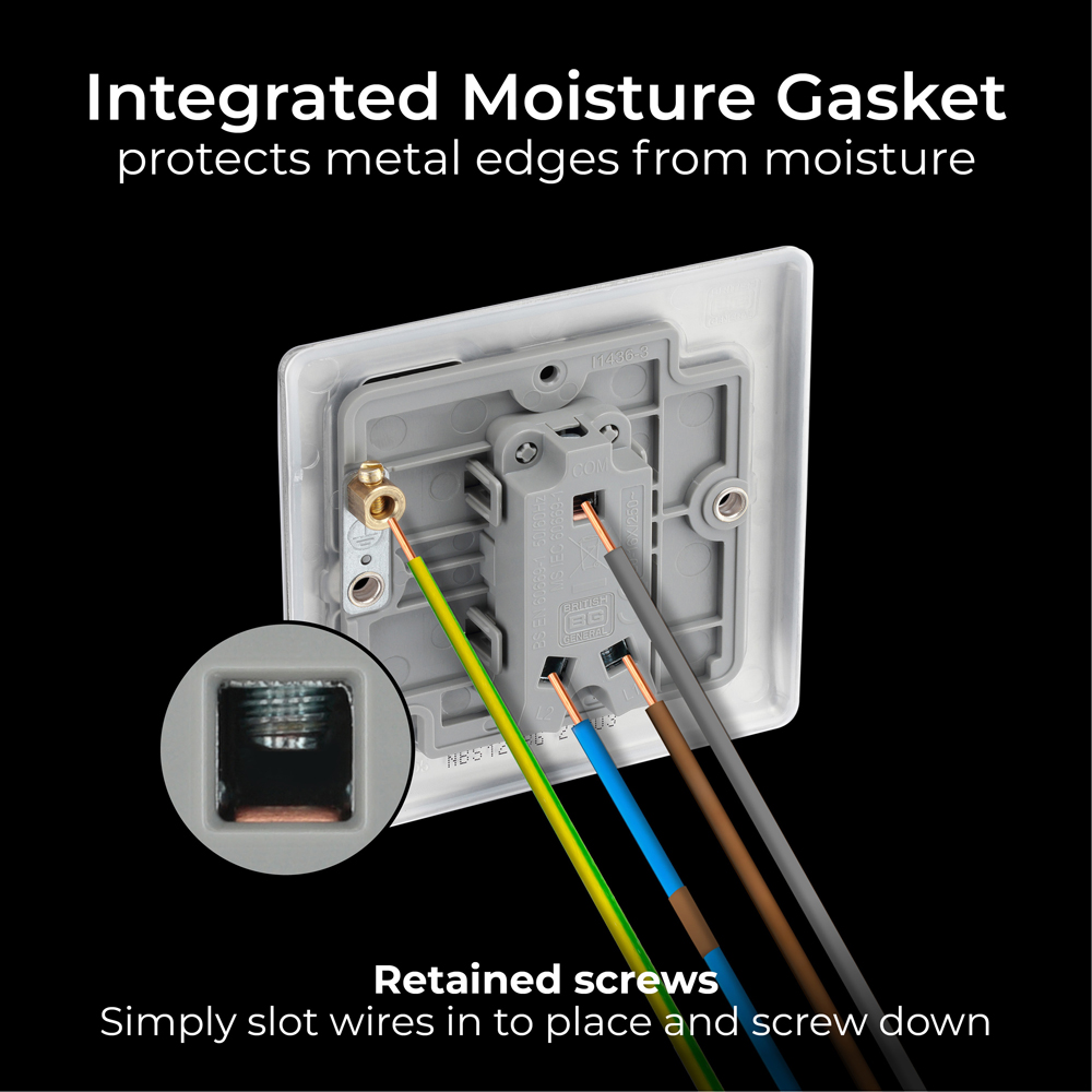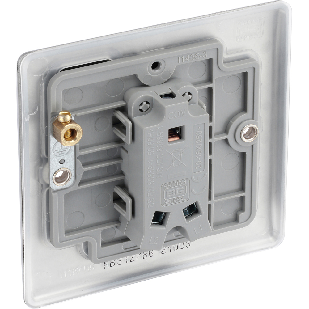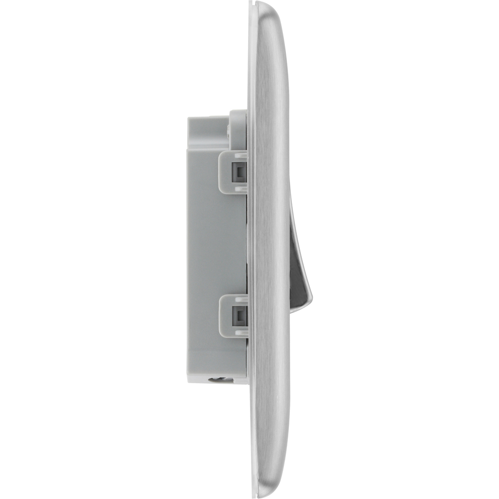 Go for the perfect power accessory with the BG Nexus 2 Way 20A Brushed Steel Single Switch 5 Pack. These single light switches come in a pack of five and feature a sleek, raised design with gently rounded edges. They include colour-matching screws and allow for two-way switching, enabling the addition of a second switch position in a circuit. This feature makes it possible to have multiple switches controlling the same light from different locations, such as the landing or hallway. The switches are equipped with a moisture control gasket to prevent tarnishing, and the captive, backed-out terminal screws allow for quick and easy installation. With their high quality and stylish design, they make a great addition to any decor.