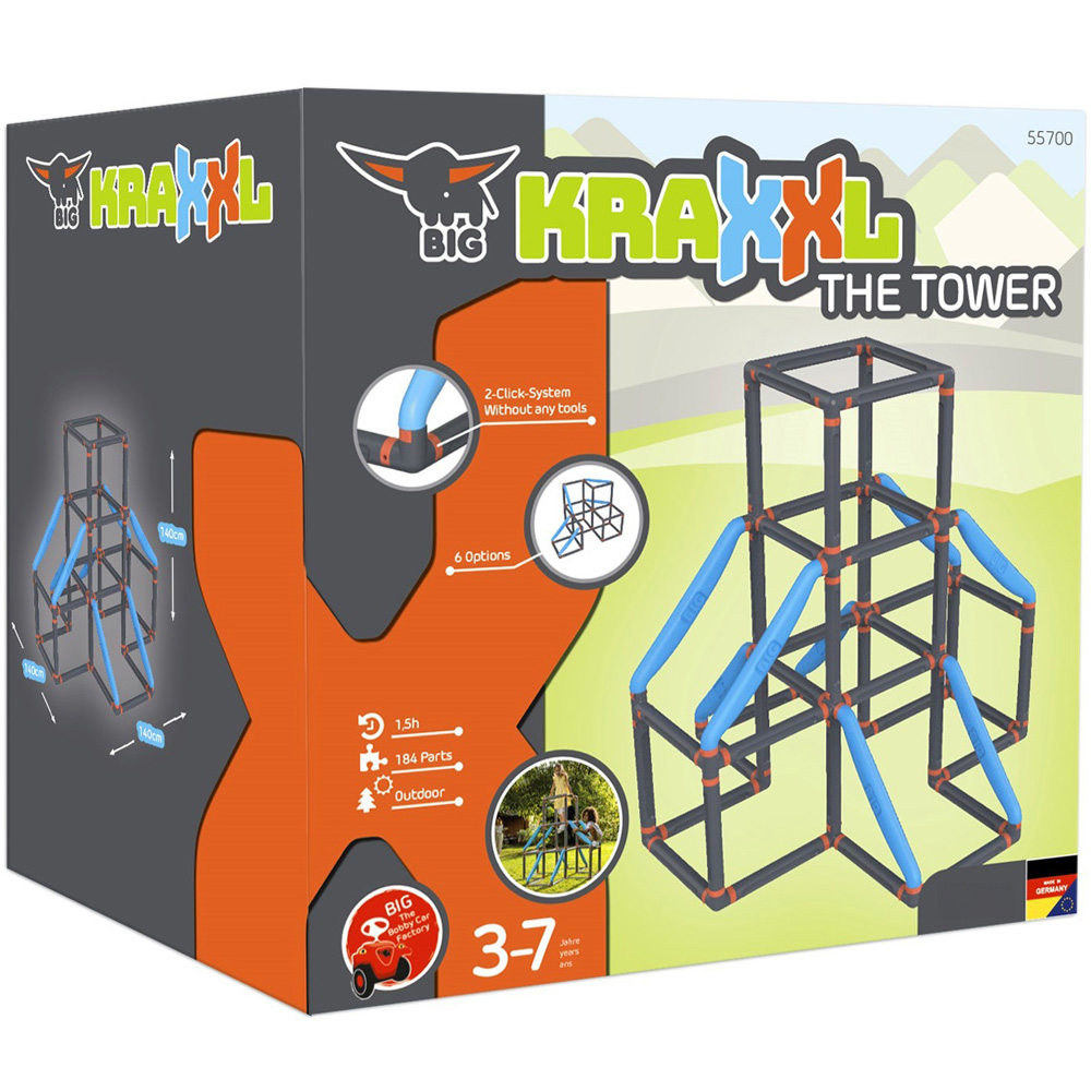 Your children will have endless fun with the BIG Kraxxl Tower. It is an exceptional and robust climbing frame that offers ultimate fun for children and promotes their physical activity, movement and motor skills. This climbing frame ensures extreme stability with the help of its very stable and flexible straight bars and unique diagonal traverses. The poles, which are produced using the blow moulding process allow the climbing frame to bear a load of up to 100kg. It features an innovative two-click system and assembling this frame is quick and easy without using any tools. The secure connection of the two-click system clamps can only be opened by adults to ensure maximum safety. The U-hooks included in the set provide additional stability, allowing the climbing frame to be securely fixed to the ground. The assembled climbing frame is 140 cm high and consists of three floors. It comes with numerous flexible construction options for creating different sizes and numbers of floors, so the children can have a delightful time. It includes two large coloured rings which turn the climbing frame into a basketball hoop and goal for ball games. The children can demonstrate their throwing and shooting skills and master sporting challenges. The design of this high-quality climbing frame is an absolute highlight in every garden and the weatherproof, UV-stabilized plastic material withstands all weather conditions without fading or becoming brittle. Easy and hygienic to clean. Suitable for kids aged between three to seven years.