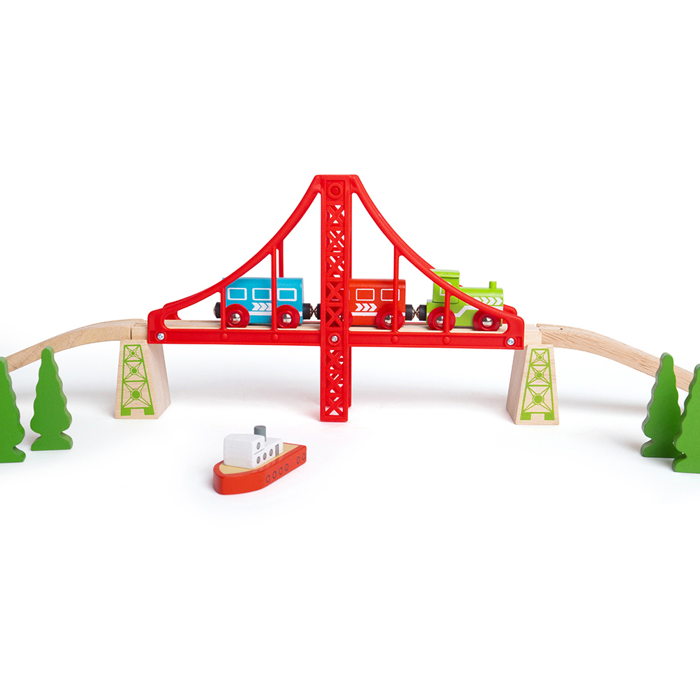 Add a touch of glamour to your little one's wooden rail set with the Bigjigs Rail Kids 7 Piece Double Suspension Bridge Set. This set includes two red suspension bridges, three high-level blocks and an ascender and descender track. Constructed from high-quality, responsibly sourced materials, the sturdy design ensures that the bridge stands upright even after rigorous use. This set is compatible with other engines and carriages of most other major wooden railway brands. Suitable for kids aged 3 years and older.