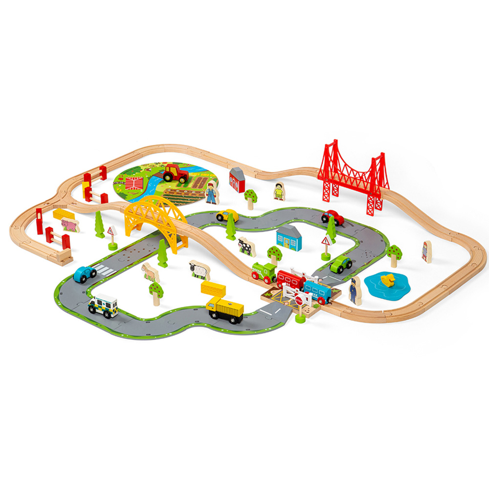 Introduce your little ones to endless fun with Bigjigs Rail Kids Road and Rail Train Set. The two-lane roadway passes under the track and through a level crossing, while the train and brightly coloured carriages head out to the countryside. This wooden train set includes farmyard animals, vehicles, trees and town and country folk aplenty. It interconnects railway tracks and roadways, ensuring children have plenty to interact with. Made from high-quality, responsibly sourced materials - it conforms to current European safety standards. The set consists of 80 play pieces.