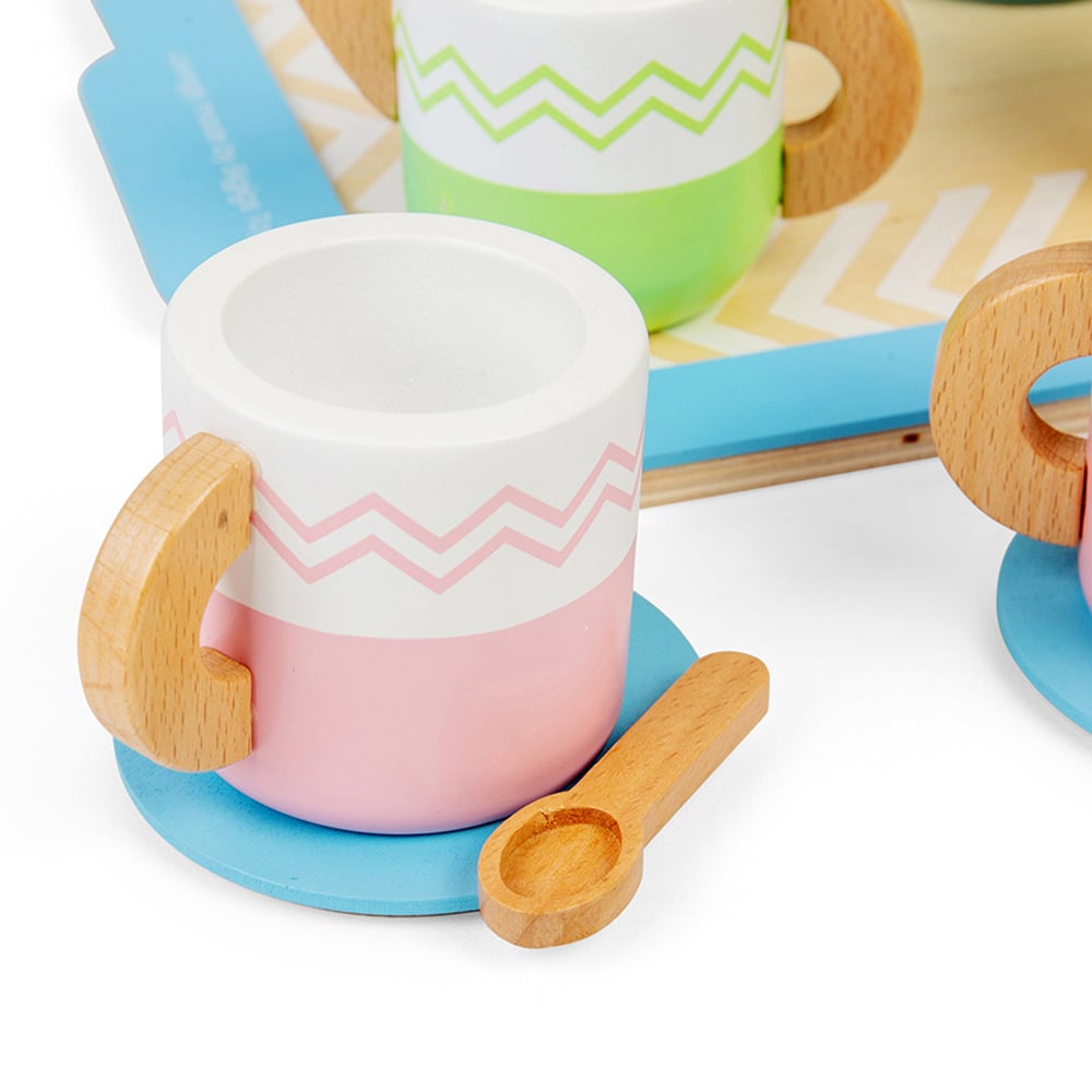 Keep your little one busy and entertained with this Bigjigs Toys 10-Piece Wooden Tea Tray Set. This beautiful wooden tea set includes a teapot, two cups and saucers, two teaspoons, a milk jug, a sugar pot and a tea tray. The set has been crafted in soft shades of blue, pink, green and yellow, with stylish geometric prints and touches of natural wood. It inspires imaginative play, which can help to enhance children’s creativity, vocabulary and communication skills. The set is made from sustainably sourced FSC-certified wood and coloured with non-toxic paints and lacquers. Plus, it conforms to current European safety standards.
