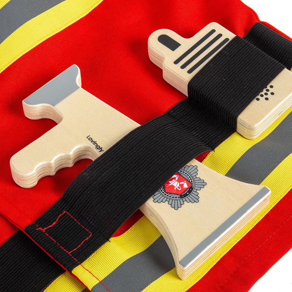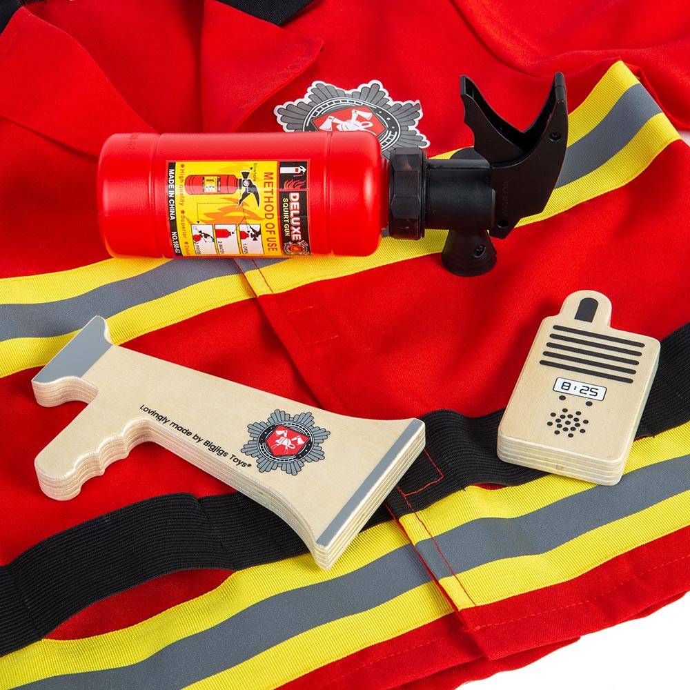 Entertain your little ones' inner firefighter with this Bigjigs Toys Firefighter Dress Up. Whether it’s putting out fires or rescuing cats from trees, the pretend play possibilities are infinite. This dressing up clothes set comes with a bright red Firefighter jacket with striped sleeves and a badge, a wooden fire extinguisher, walkie talkie radio and megaphone. Suitable for ages three to five years. The jacket measures H46.5cm x W40.5cm. Arm length: 45cm. Note: A fireman's helmet is available to buy separately.